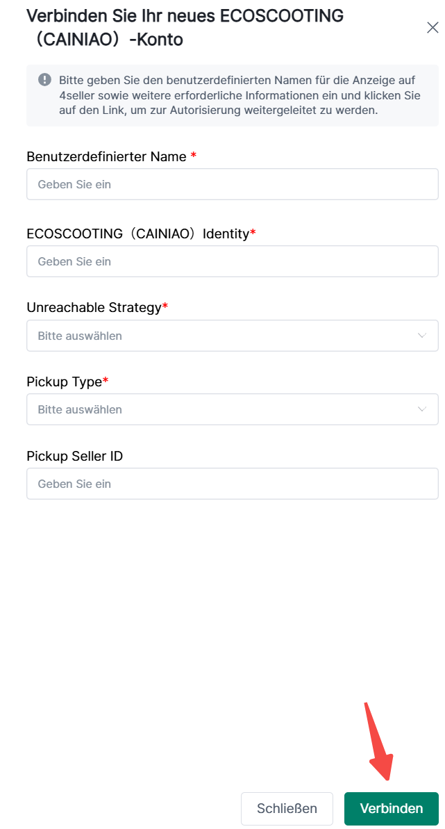 Klicke auf Einstellungen und suche Versanddienstleister in Bestellung&Versand. Klicke anschließend auf das CaiNiao ES-Symbol, um ein neüs Konto hinzuzufügen.Schritt 2: Es öffnet sich ein neüs POP-UP. Gebe dort den Name, CaiNiao Identity, Unreachable Strategy, Pickup Type ein. Diese Informationen bekommest du vom CaiNiao-Support. Bestätige Informationen und klicke auf Verbinden.