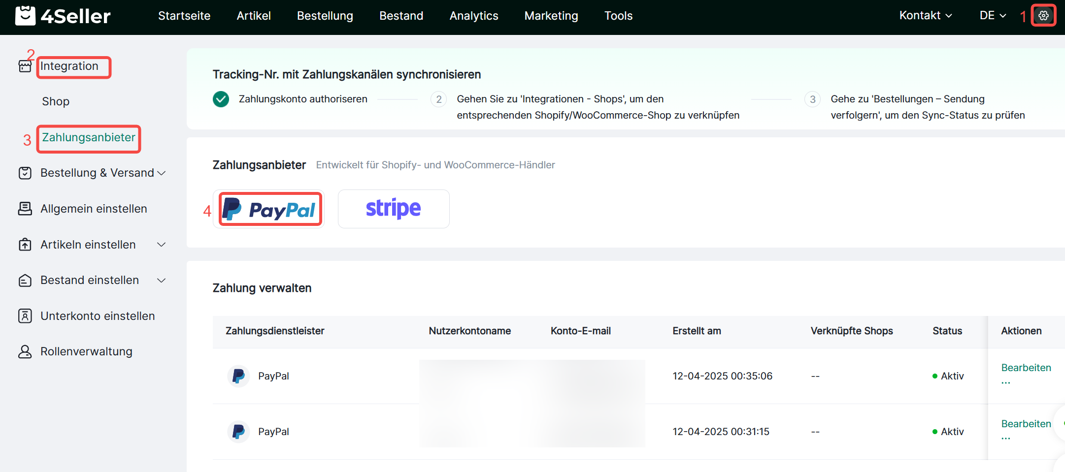 4Seller unterstützt die Integration mit PayPal-Konten um Auszahlungen zu beschleunigen, Streitigkeiten & Rückerstattungen zu minimieren und den Verkäuferschutz zu verbessern.