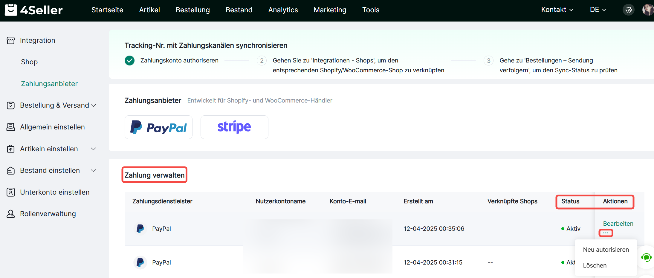 Schritt 5: Einstellungen--Zahlung--Zahlungsverwaltung--Status prüfen & bearbeiten & löschen & neu verbinden