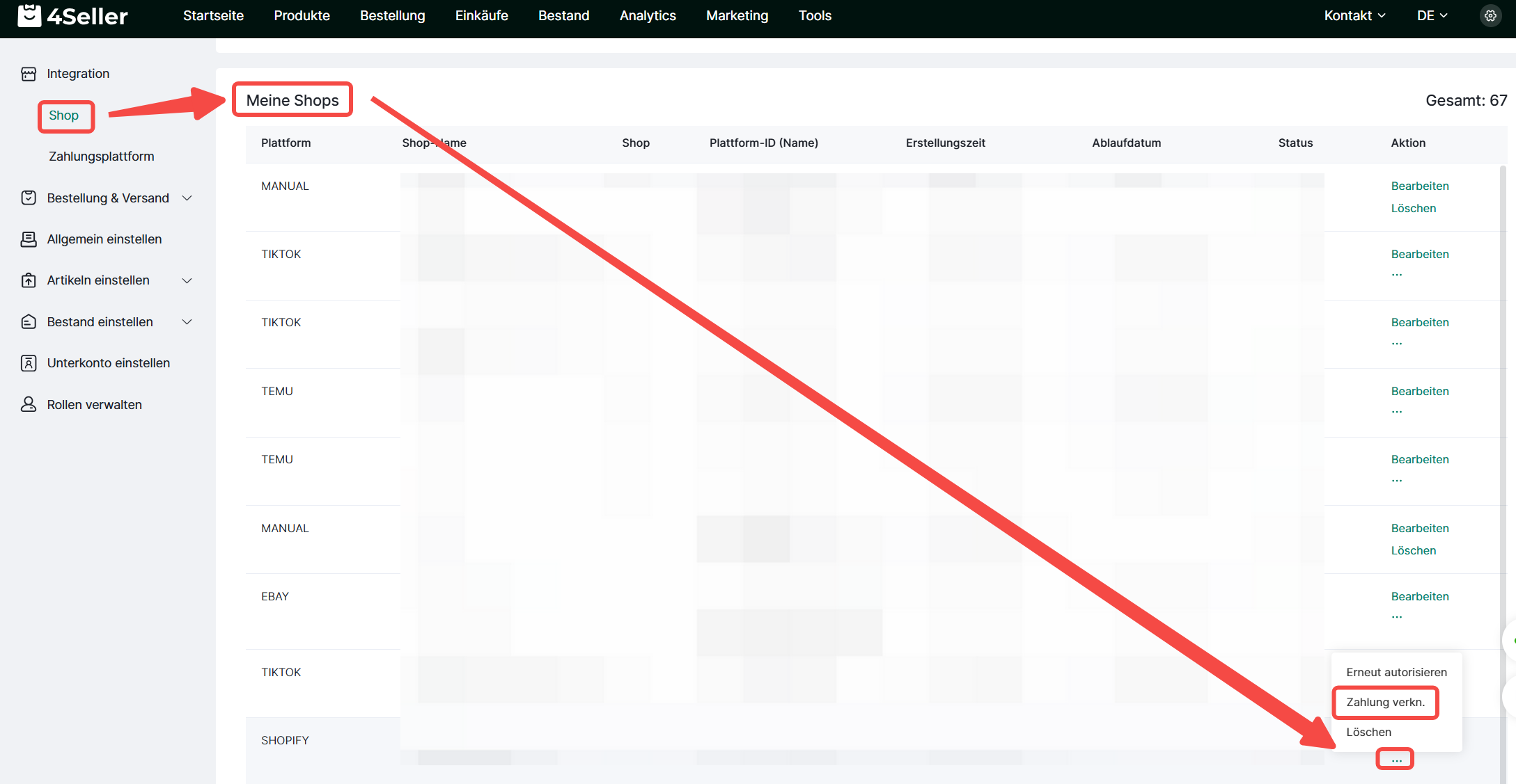 Schritt 2: Einstellungen → Integration → Shops → Mein Shop → Shopify/WooCommerce auswählen → Zahlungsmethode verknüpfen