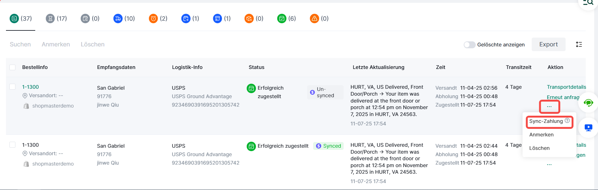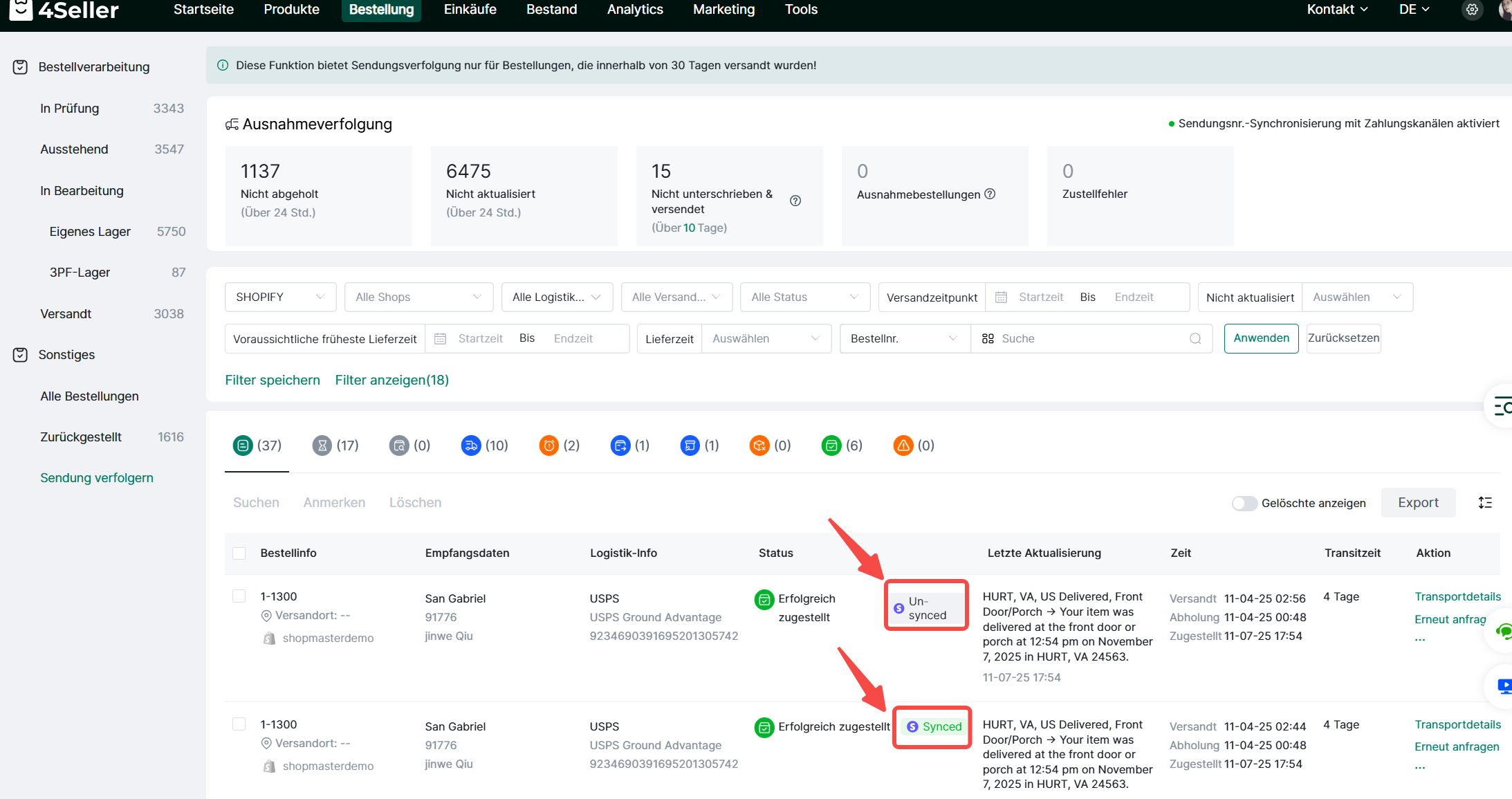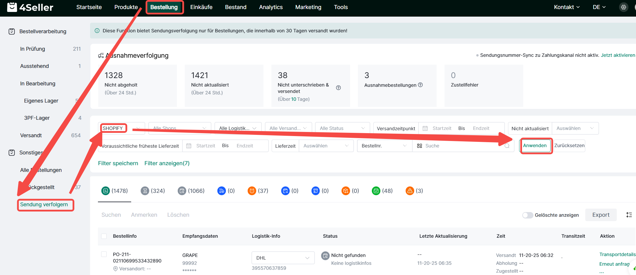 Schritt 4: Bestellungen → Sendungsverfolgung → Shopify/WooCommerce-Shop filtern → Verknüpfungsstatus prüfen