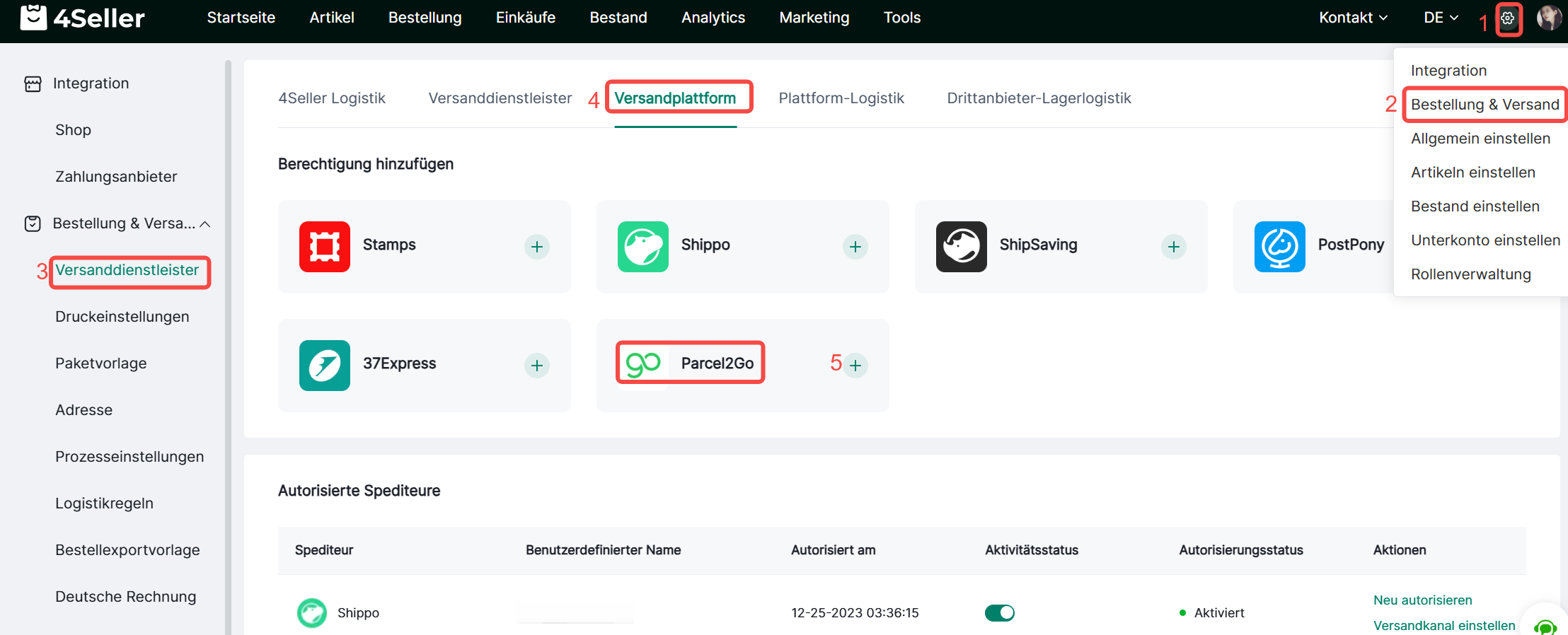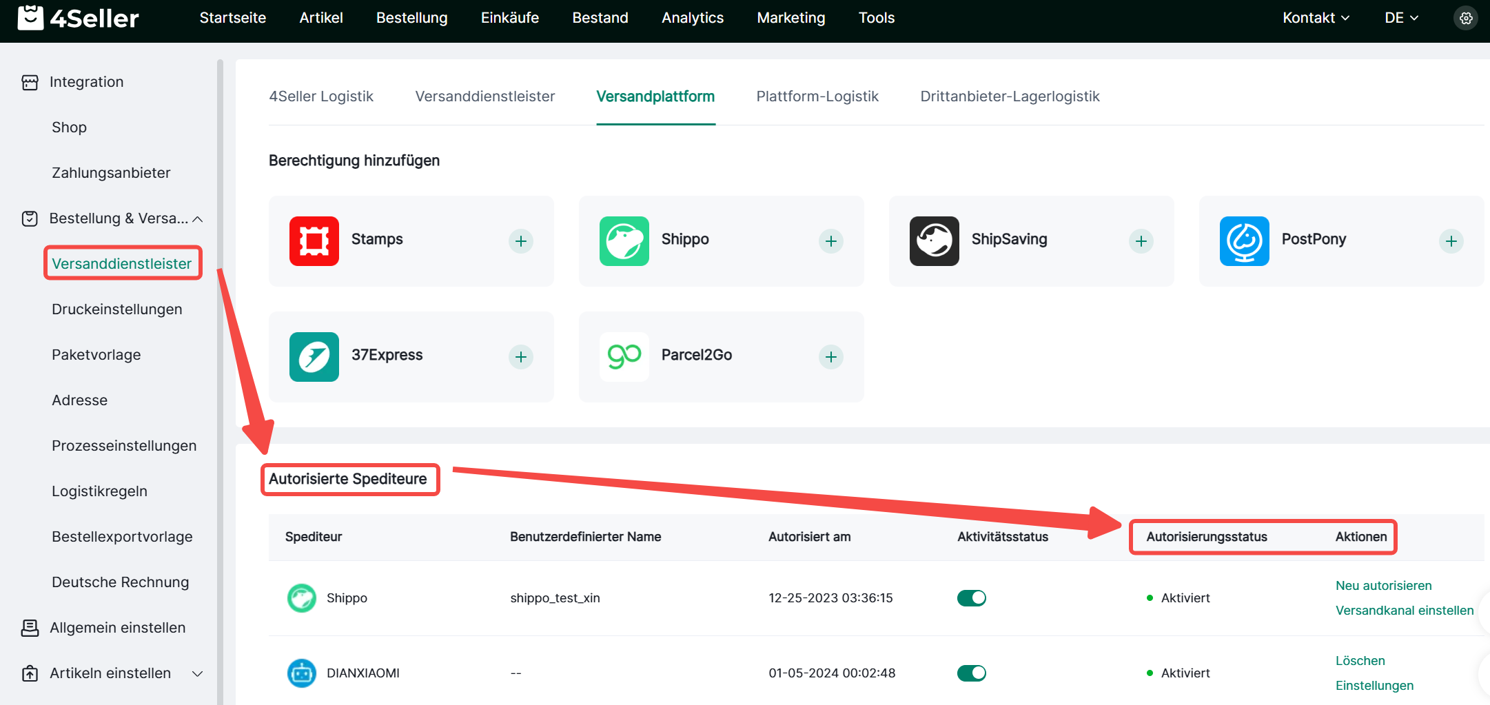 3. Nach erfolgreicher Autorisierung erscheint der Dienst unter 'Autorisierte Carrier'. Sie können den Autorisierungsstatus einsehen, neu autorisieren oder Versandkanäle konfigurieren.