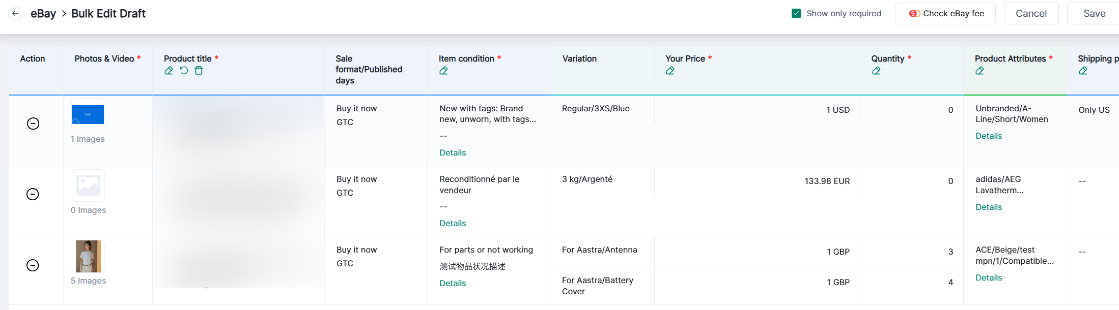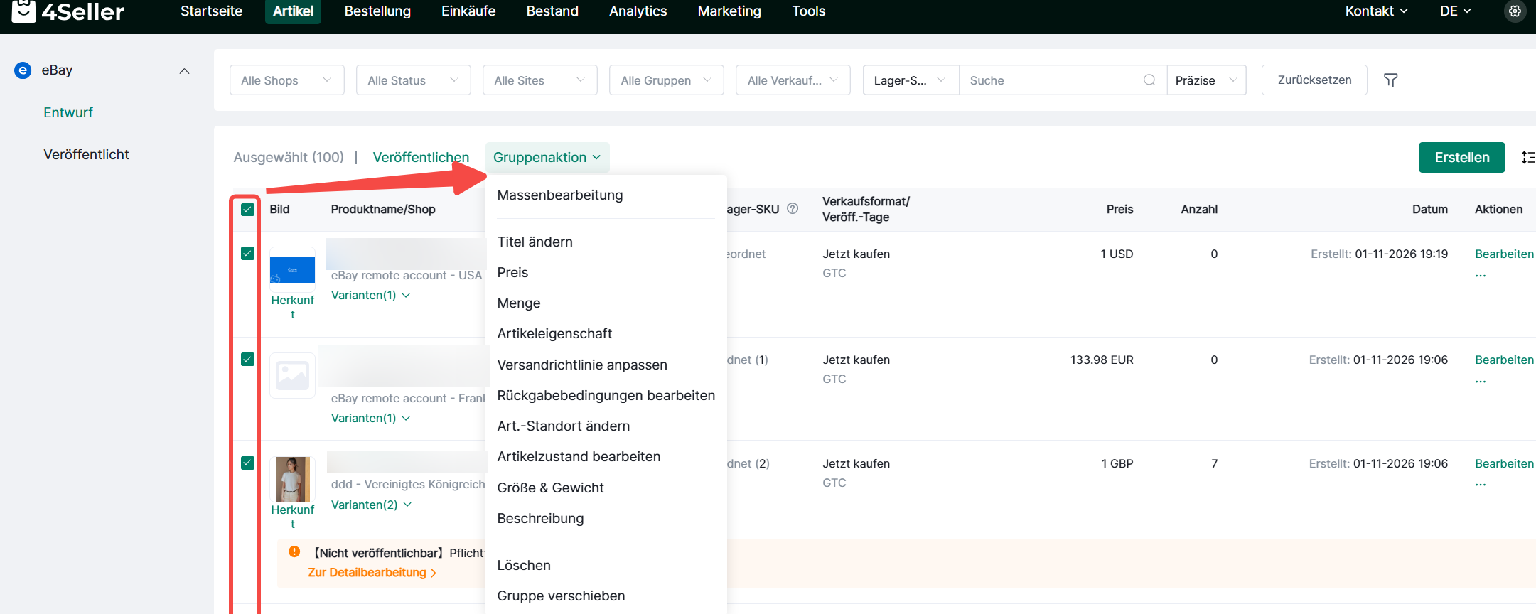 4Seller unterstützt die Stapelbearbeitung einzelner Attribute über mehrere Produkte hinweg, um die Listungseffizienz für eBay zu steigern.