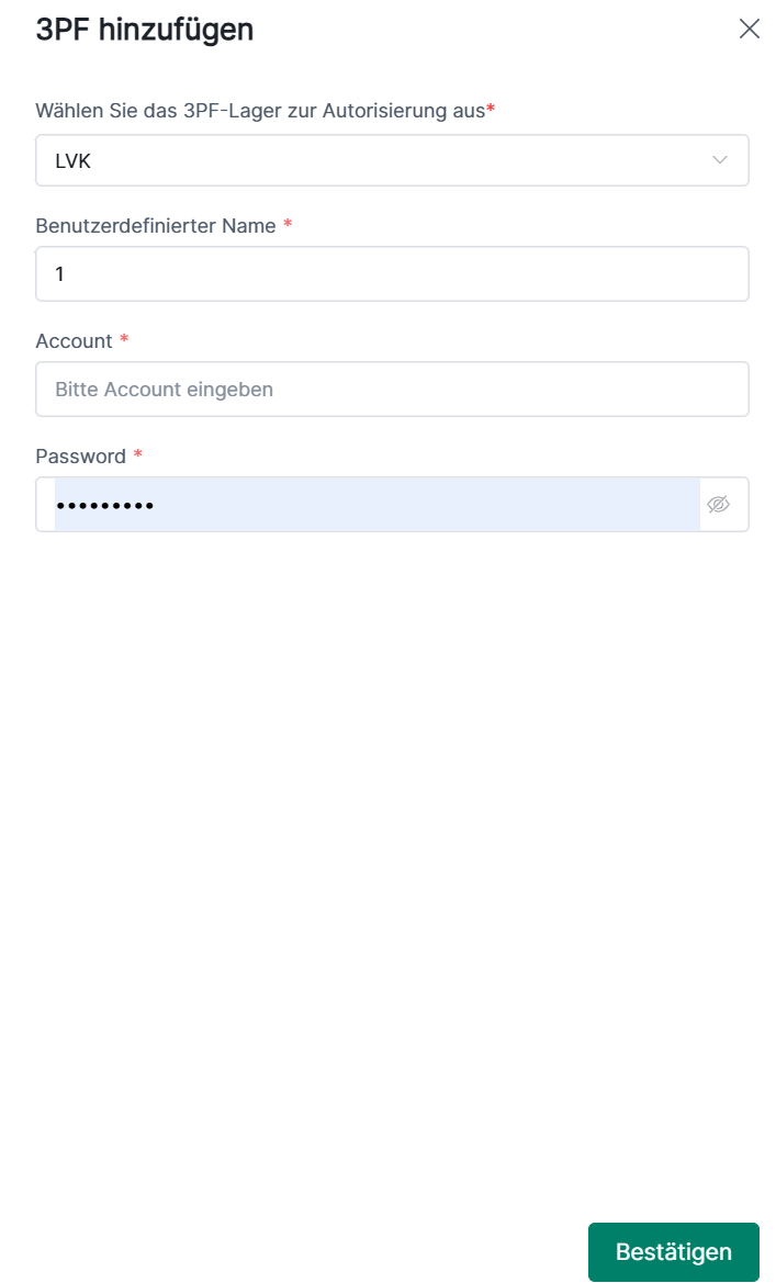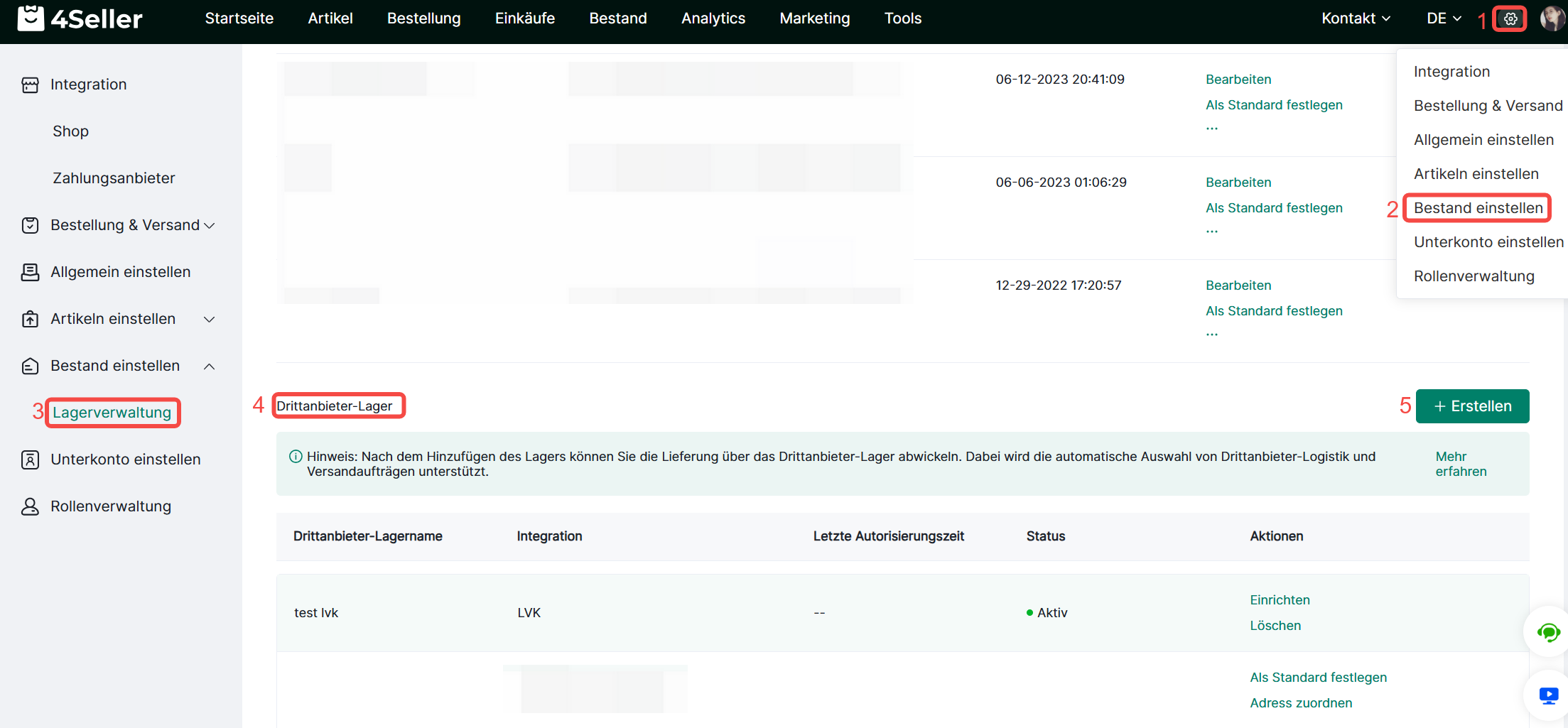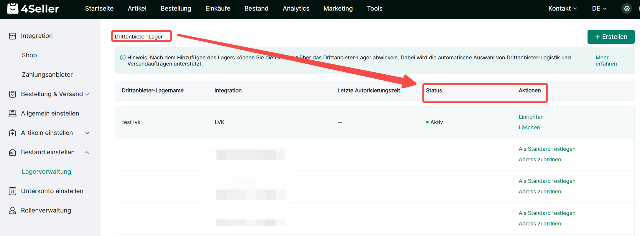 1. Klicken Sie auf Einstellungen > Bestand einstellen > Lagerverwaltung >Drittanbieter-Lager > Erstellen.