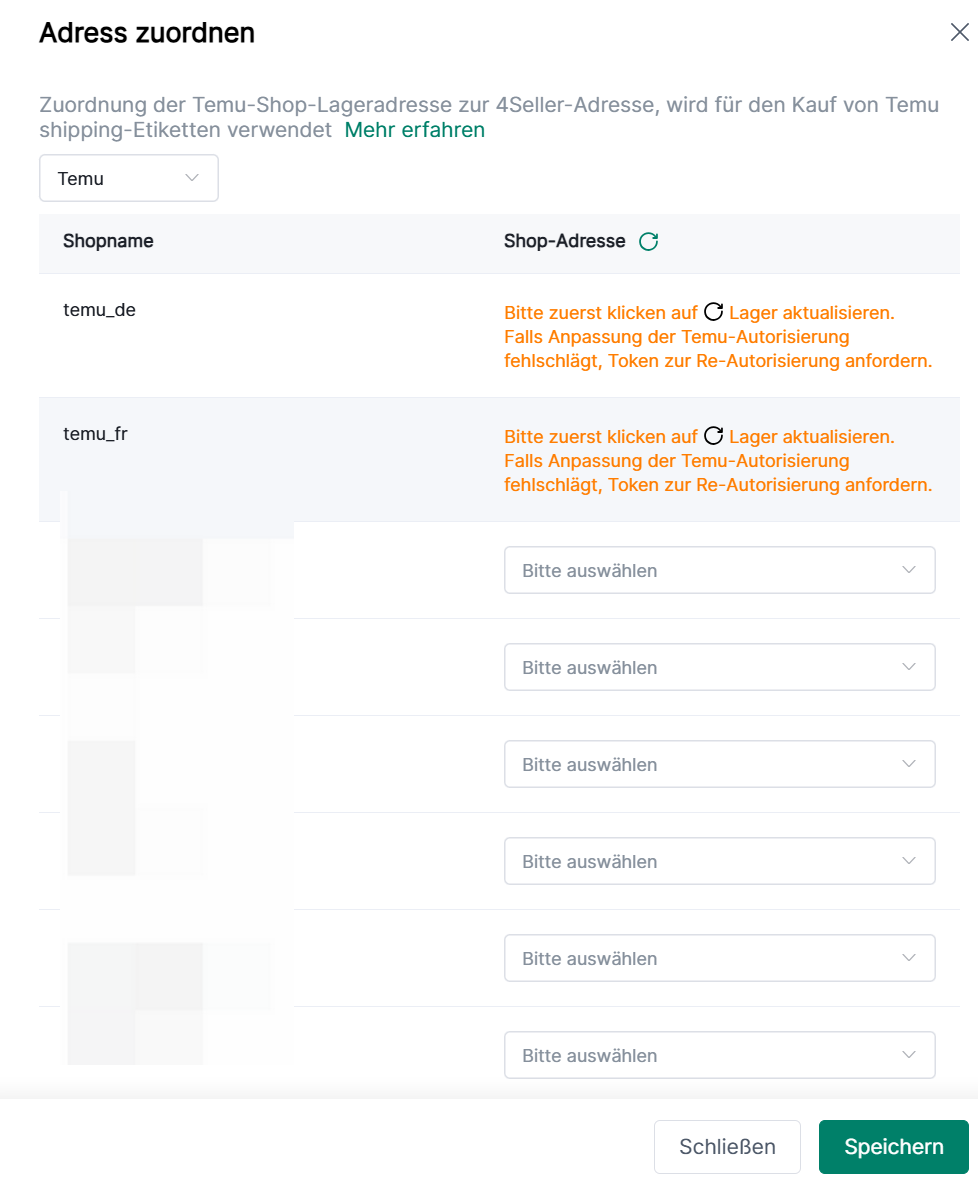 5. Die Adresszuordnung verknüpft Ihre Temu Store-Lageradresse mit Ihrer 4Seller-Adresse für den Kauf von Versandetiketten über Temu Shipping.