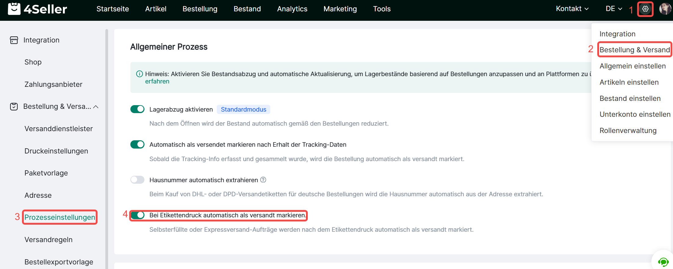 Einstellungen--Bestellung & Versand--Prozesseinstellung--Schalter für Automatische Markierung als versandt nach Etikettendruck aktivieren