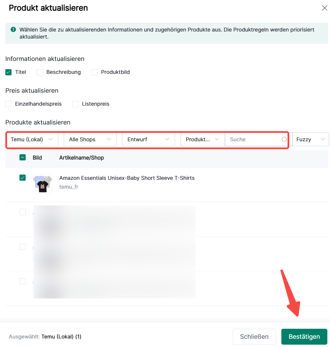 3. Filtern Sie nach Informationen wie Plattform-Standort, Shop und Listing-Status, um relevante Produkte für die Aktualisierung auszuwählen.