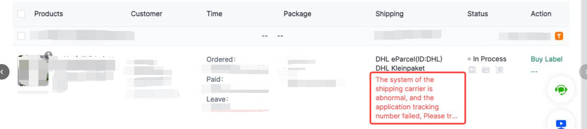 Beim Kauf von Versandetiketten über DHL ist folgender Fehler aufgetreten: The system of the shipping carrier is abnormal, and the application tracking number failed, Please tr... (Foto ansehen)