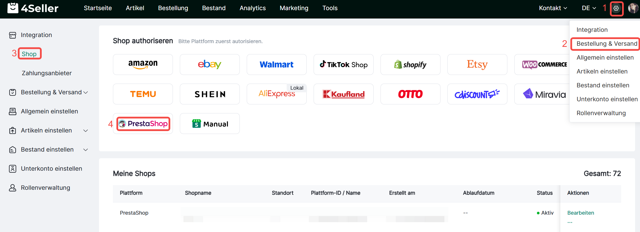 Du kannst dein PrestaShop-Konto mit 4Seller verbinden. So kannst du Listing synchronisieren, schnell Versandetiketten erstellen und Bestellungen abwickeln.Schritt 1: Gehe zur 4Seller-Seite und melde dich an. Klicke dann auf Einstellungen und suche Shop in Integration. Klicke anschließend auf das PrestaShop-Symbol, um ein neüs Konto hinzuzufügen.