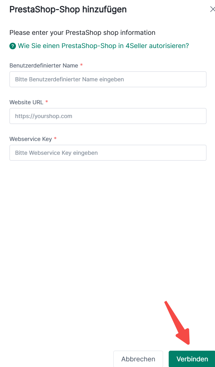 Schritt 2: Eine neue Pop-up wird oeffnet. Dort kannst du einen benutzerdefinierten Shop-Namen, Website URL und Webservice Key eingeben.