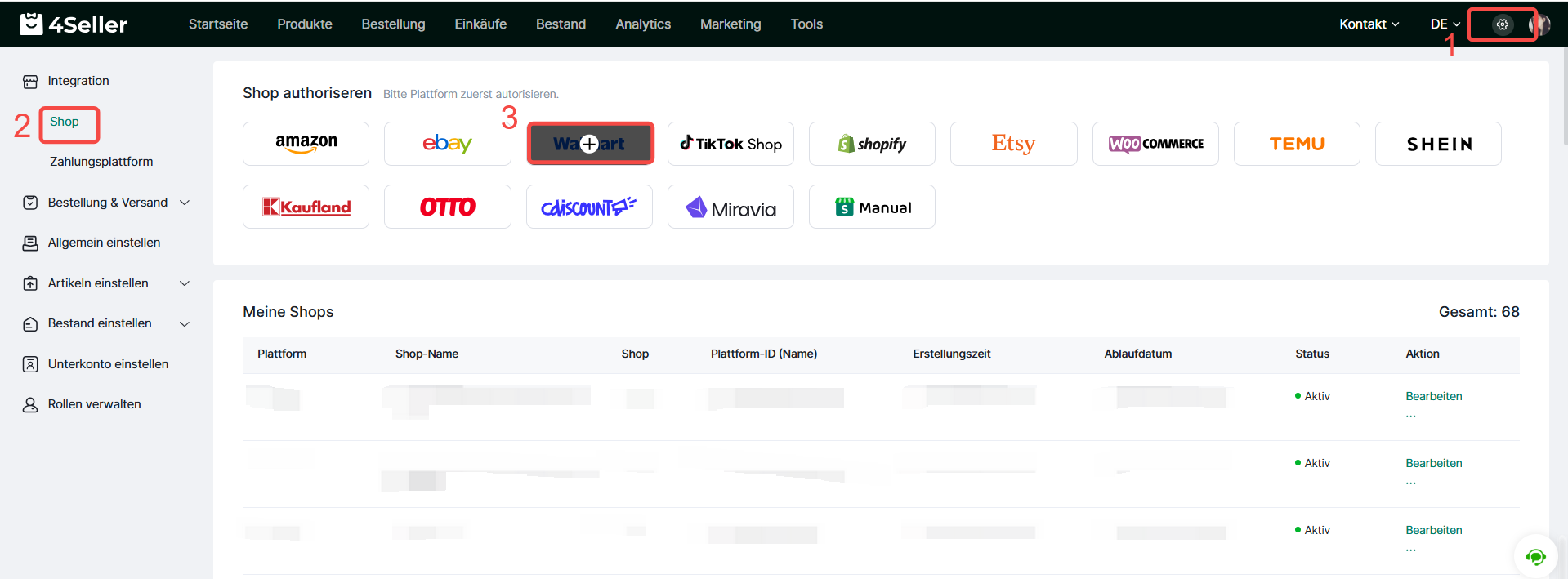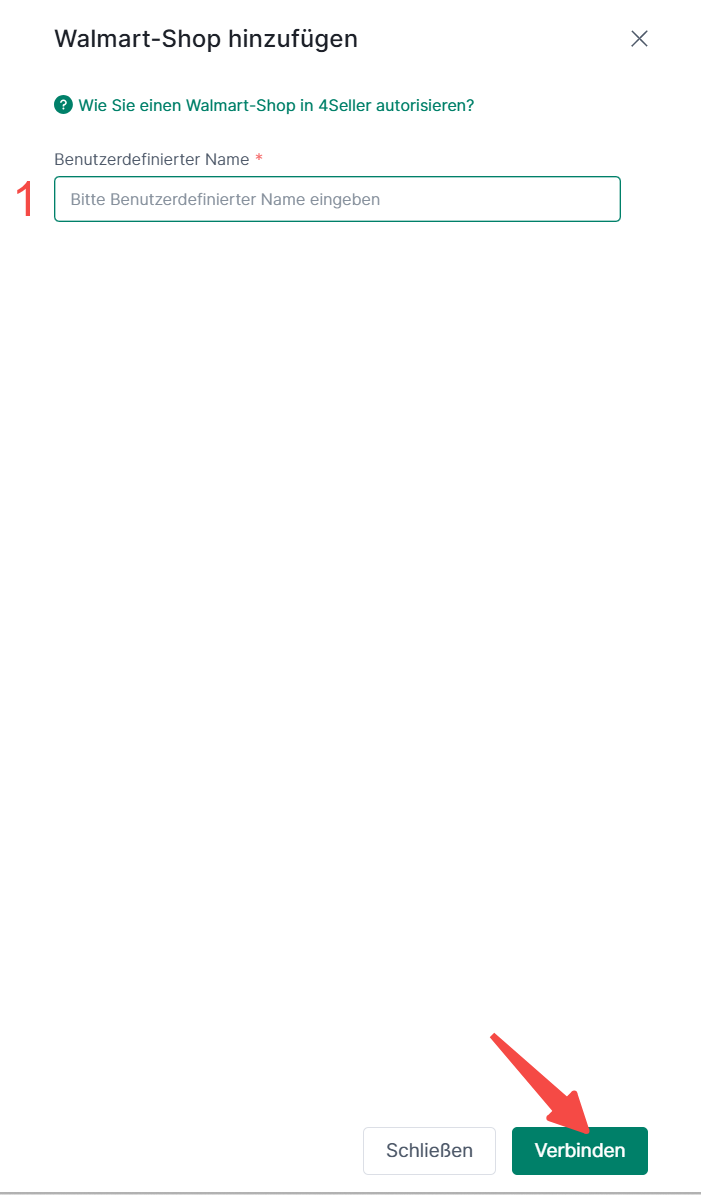 Klicke dann auf Einstellungen und suche Shop in Integration. Klicke anschließend auf das Walmart-Symbol, um ein neüs Konto hinzuzufügen.Schritt 2: Gebe den Name ein. Klicke dann auf Verbinden.