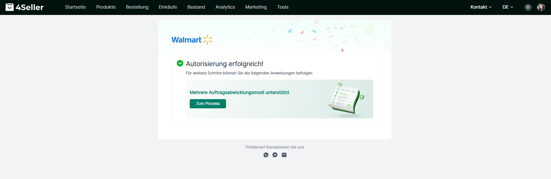 Schritt 4: Nachdem du deines Walmart-Konto bei 4Seller erfolgreich autorisiert hast, öffnet sich ein Fenster mit folgendem Screenshot.