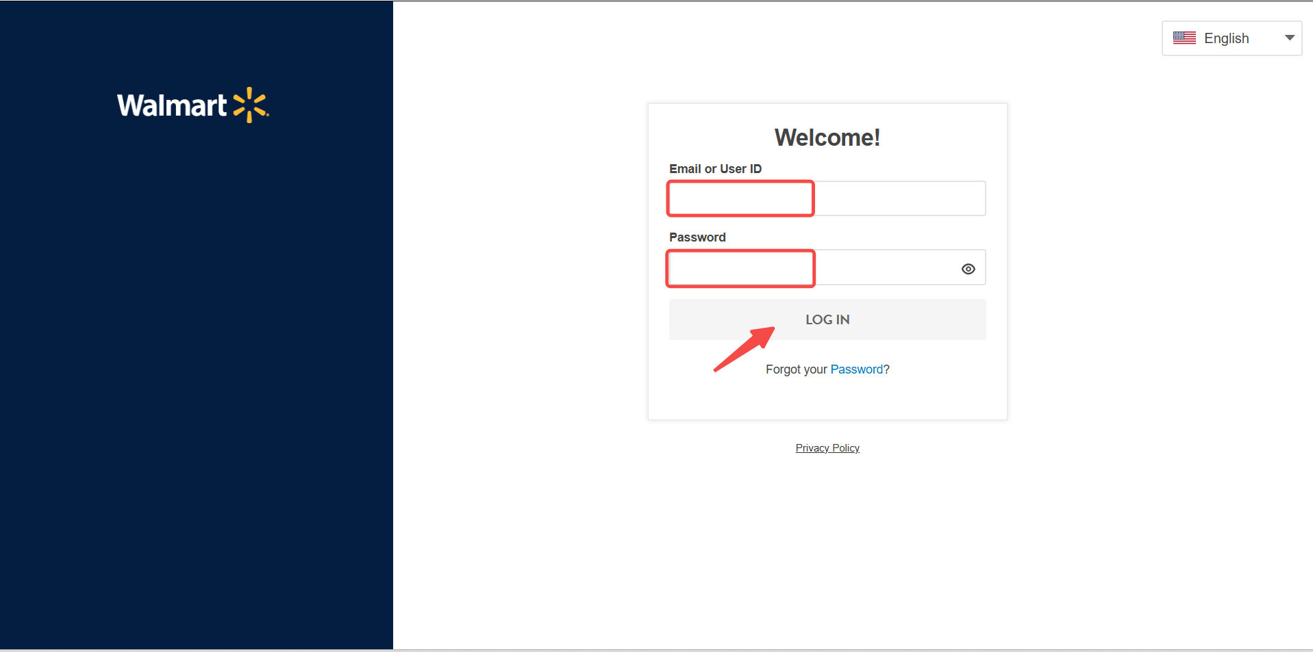 Schritt 3: Gebe deine Walmart-Konto und Passwort ein und klicke auf LOG IN.