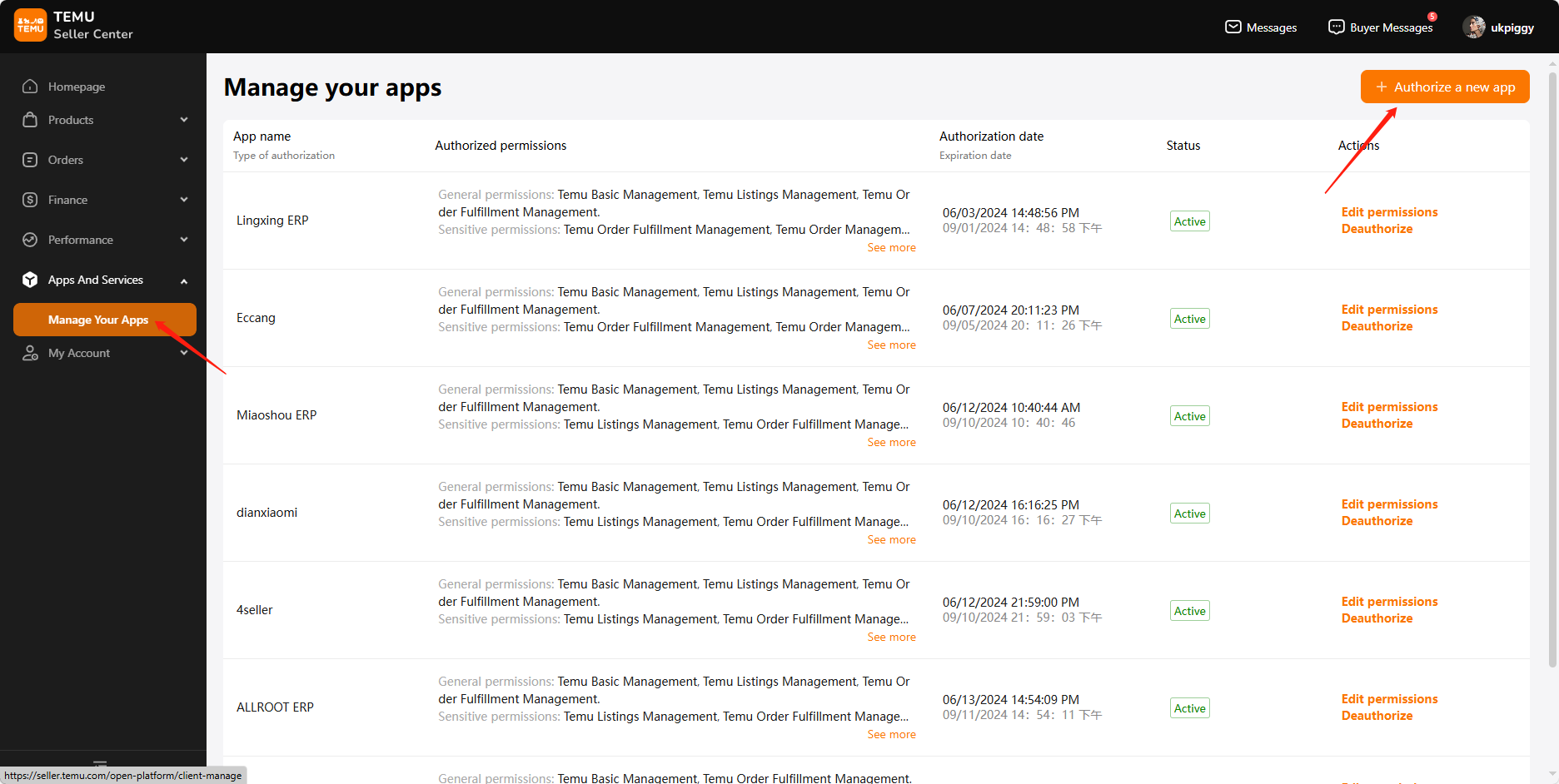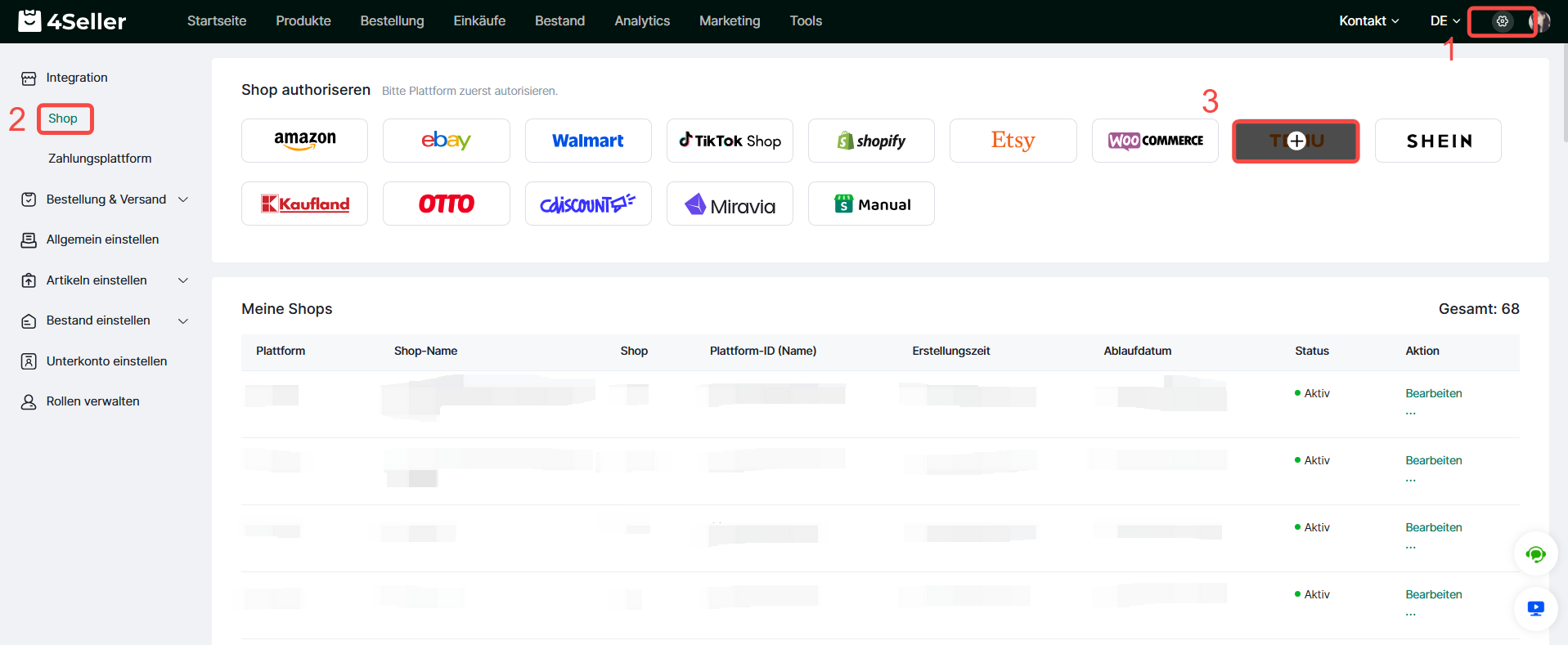 Schritt 4: Navigiere zur 4Seller Shop-Authorisisungsseite und wähle das Temu-Symbol aus.