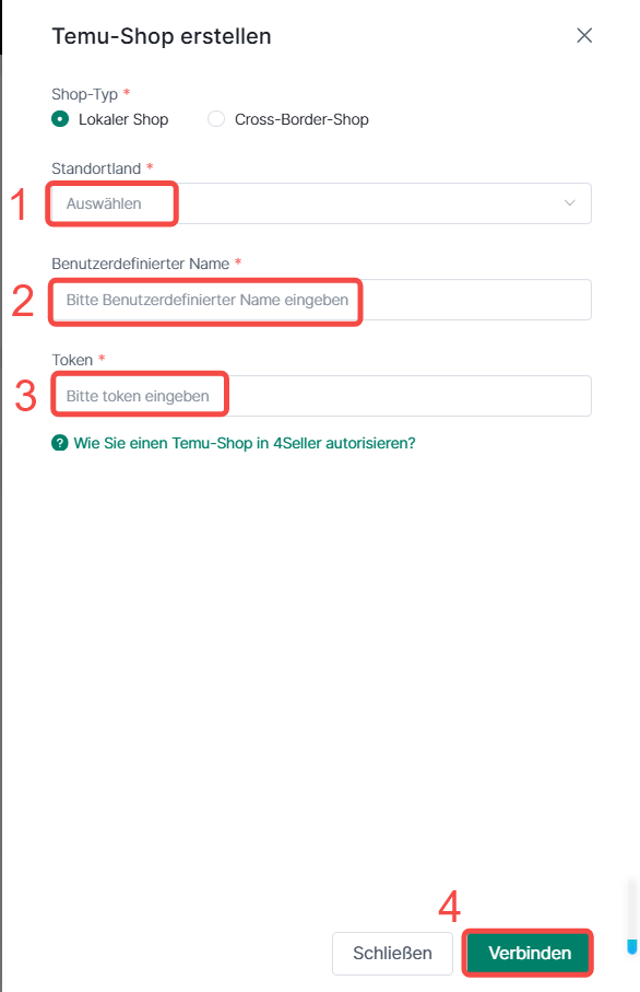Schritt 5: Wähle Shop-Typ und Standort/Land. Gebe den benutzerdefinierten Namen und Token ein, dann klicke auf Verbinden.