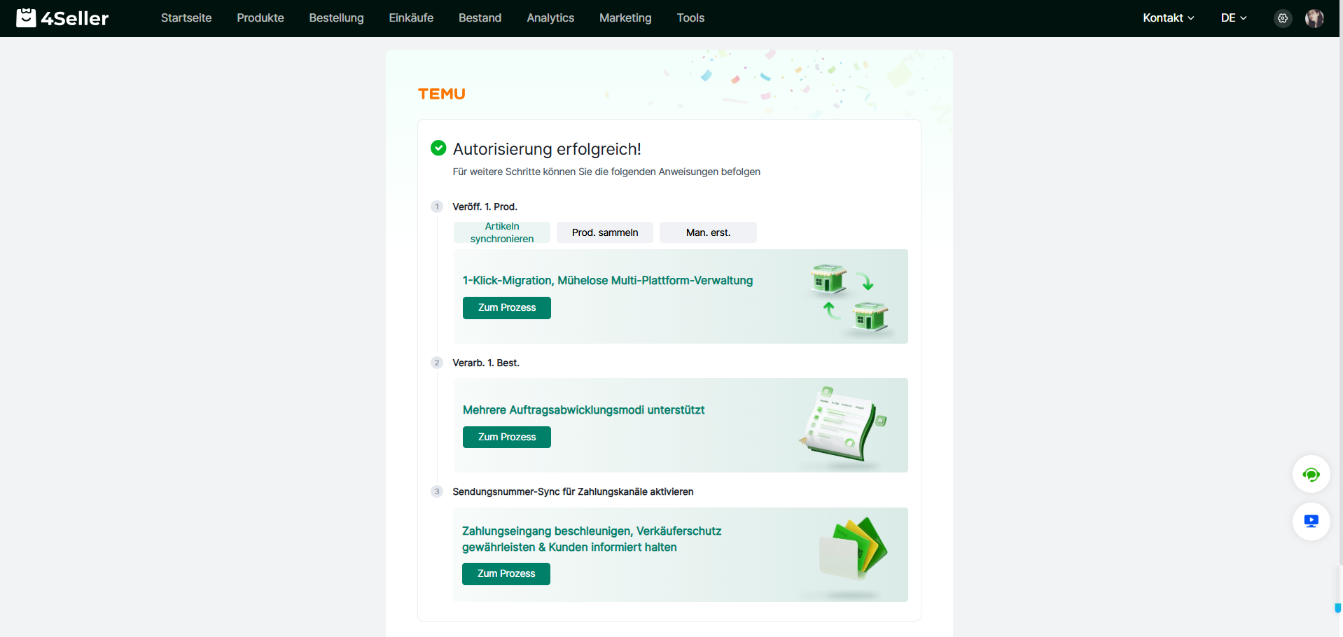 Schritt 6: Nachdem du deines Temu-Konto bei 4Seller erfolgreich autorisiert hast, öffnet sich ein Fenster mit folgendem Screenshot.