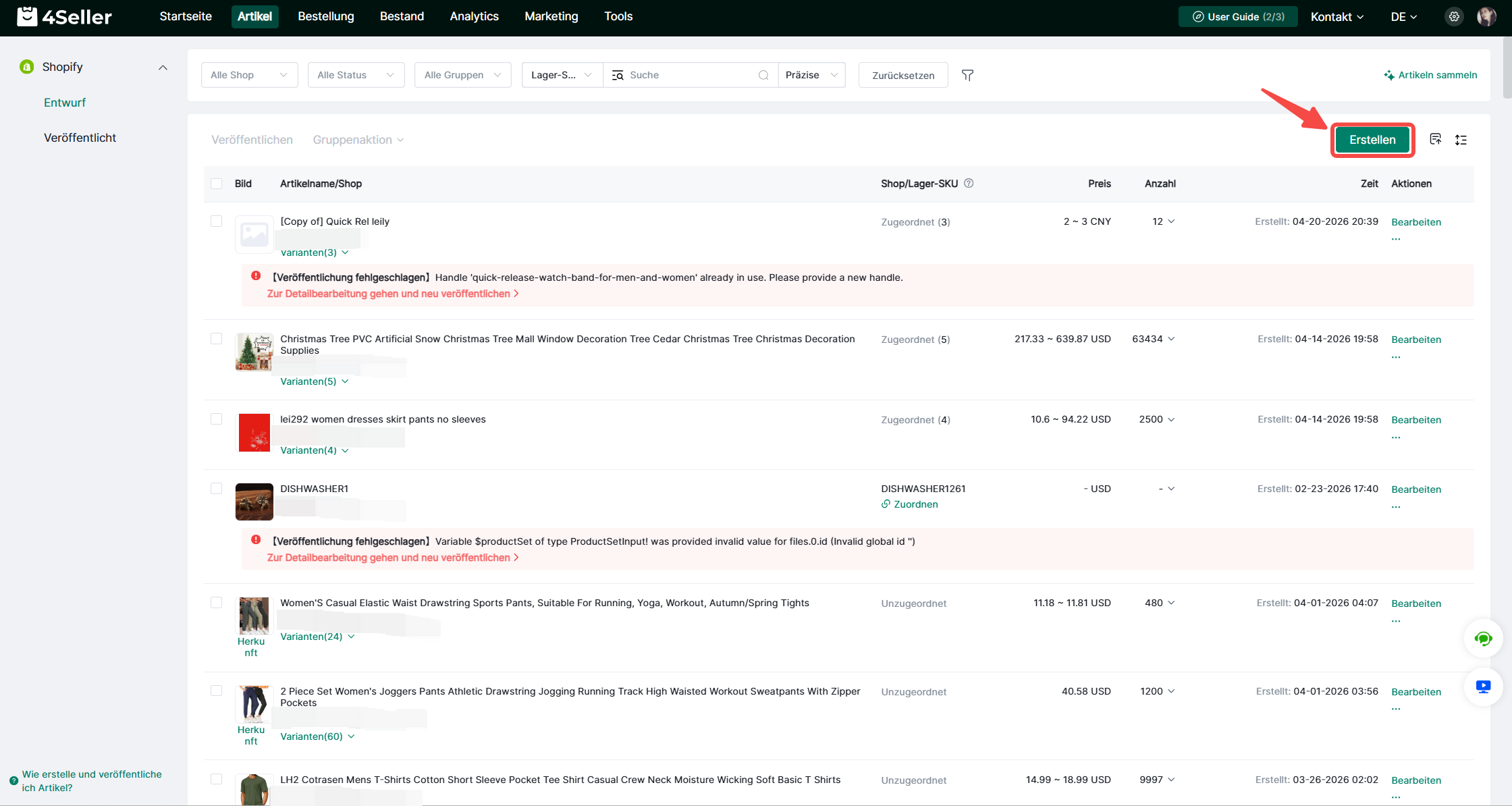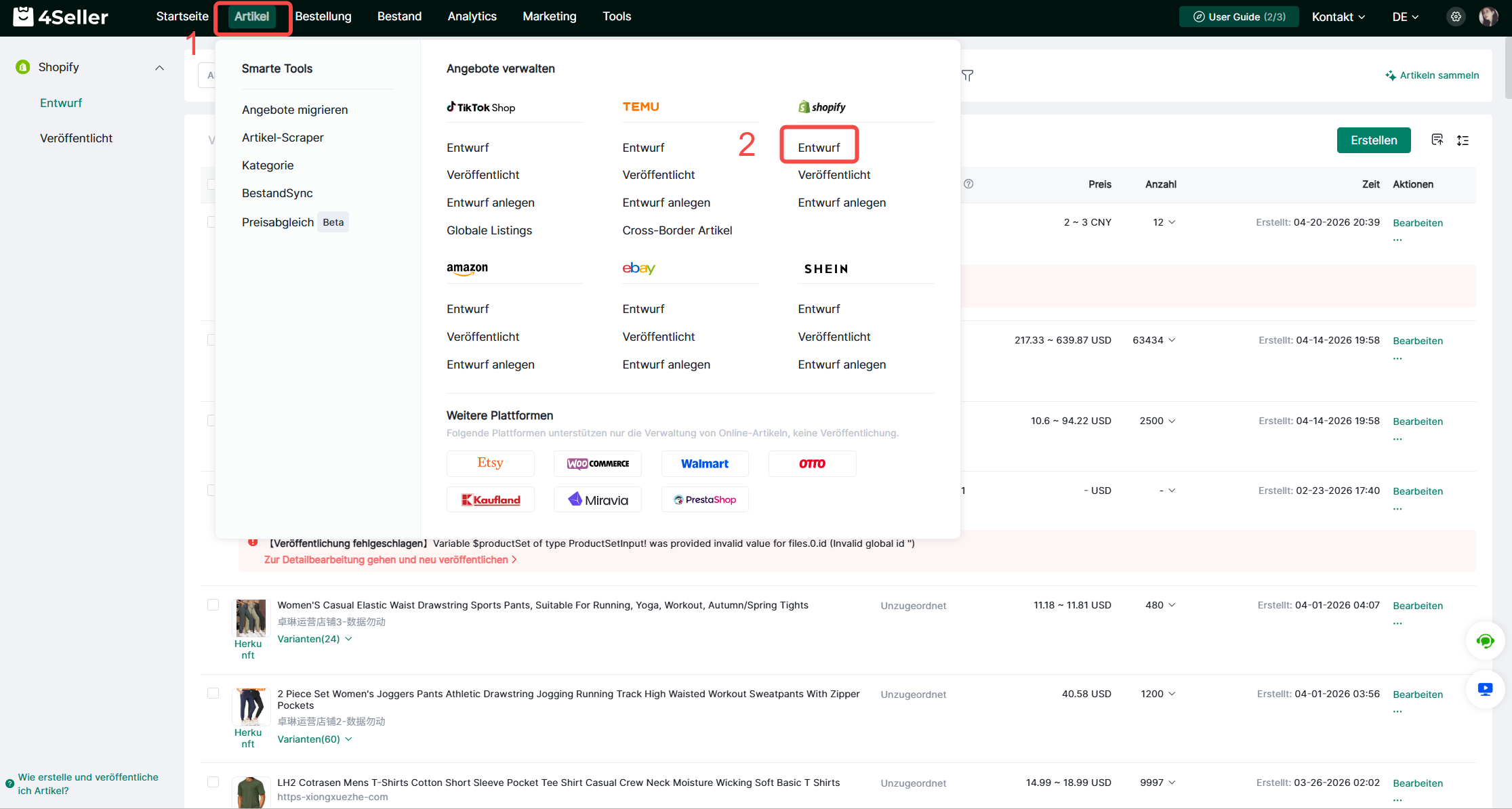Mit 4Seller kannst du Artikel erstellen und in deinem Shopify-Shop veröffentlichen. In diesem Artikel erfährst du, wie du manuell einen Entwurf erstellst und diesen anschließend in deinem Shopify-Shop veröffentlichst.Schritt 1: Gehe zu "Artikel" > "Entwurf" im Shopify-Bereich.