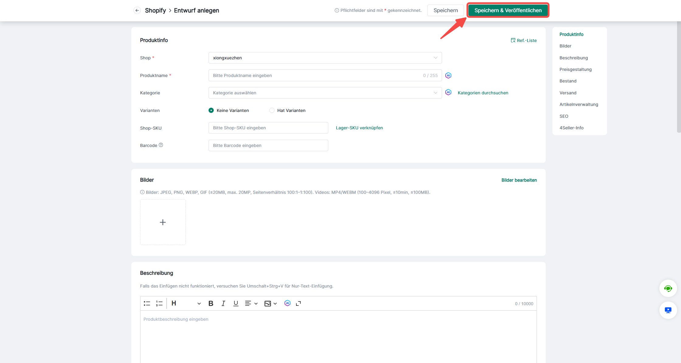 Schritt 3: Fülle die Informationen unter "Produktinfo, Bilder, Beschreibung und SEO" aus.