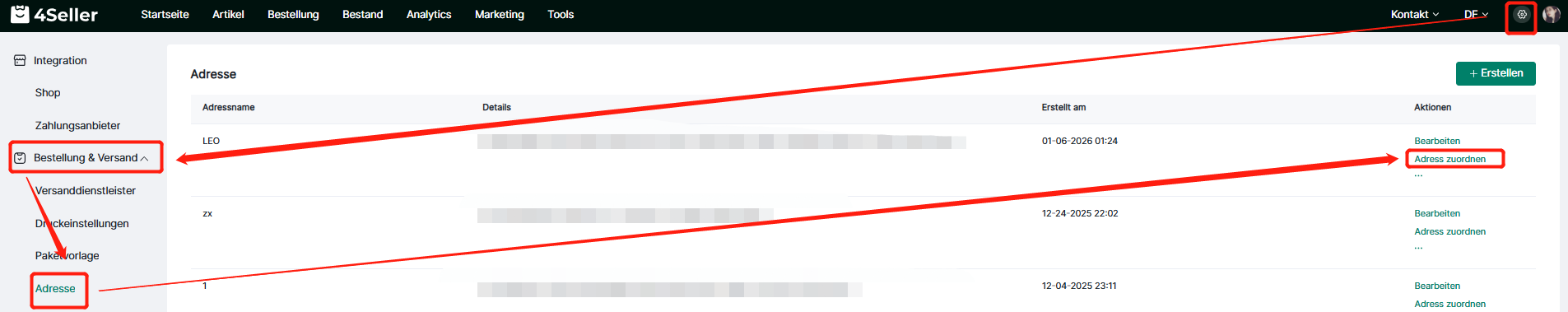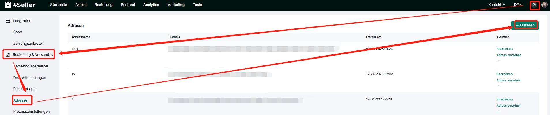 Melden Sie sich bei 4Seller an, klicken Sie auf Einstellungen – Bestellungen & Versand – Adresse, rufen Sie die Seite für die Adresseinstellungen auf; falls Sie noch keine Adresse haben, können Sie diese einrichten. Klicken Sie anschließend auf „Erstellen“.