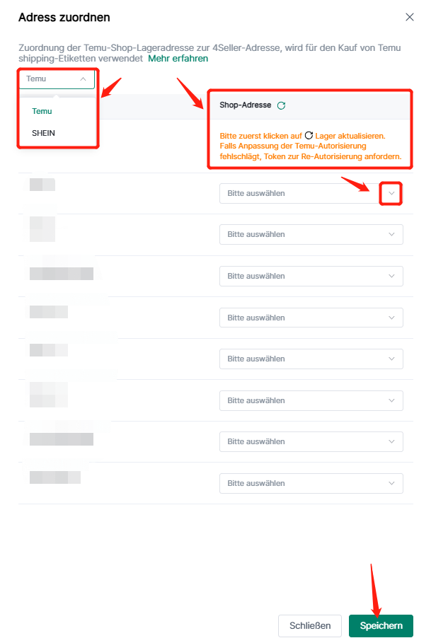 Da Temu & Shein für den Online-Versand nur Lieferadressen auswählt, die im Temu & Shein-Verkäufer-Dashboard erstellt wurden, müssen die Temu & Shein-Adressen mit den 4Seller-Adressen verknüpft werden.Die Zuordnungsschritte sind wie folgt: