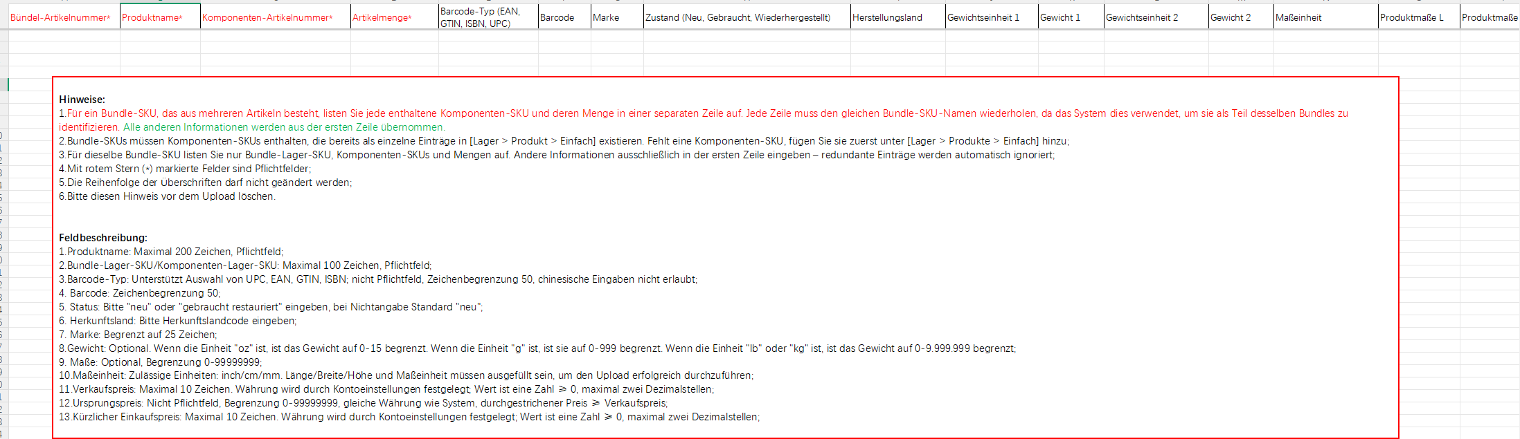 (2) Stock-SKU, Produktname und Bundle-Informationen mit Menge sind Pflichtfelder, die ausgefüllt werden müssen.