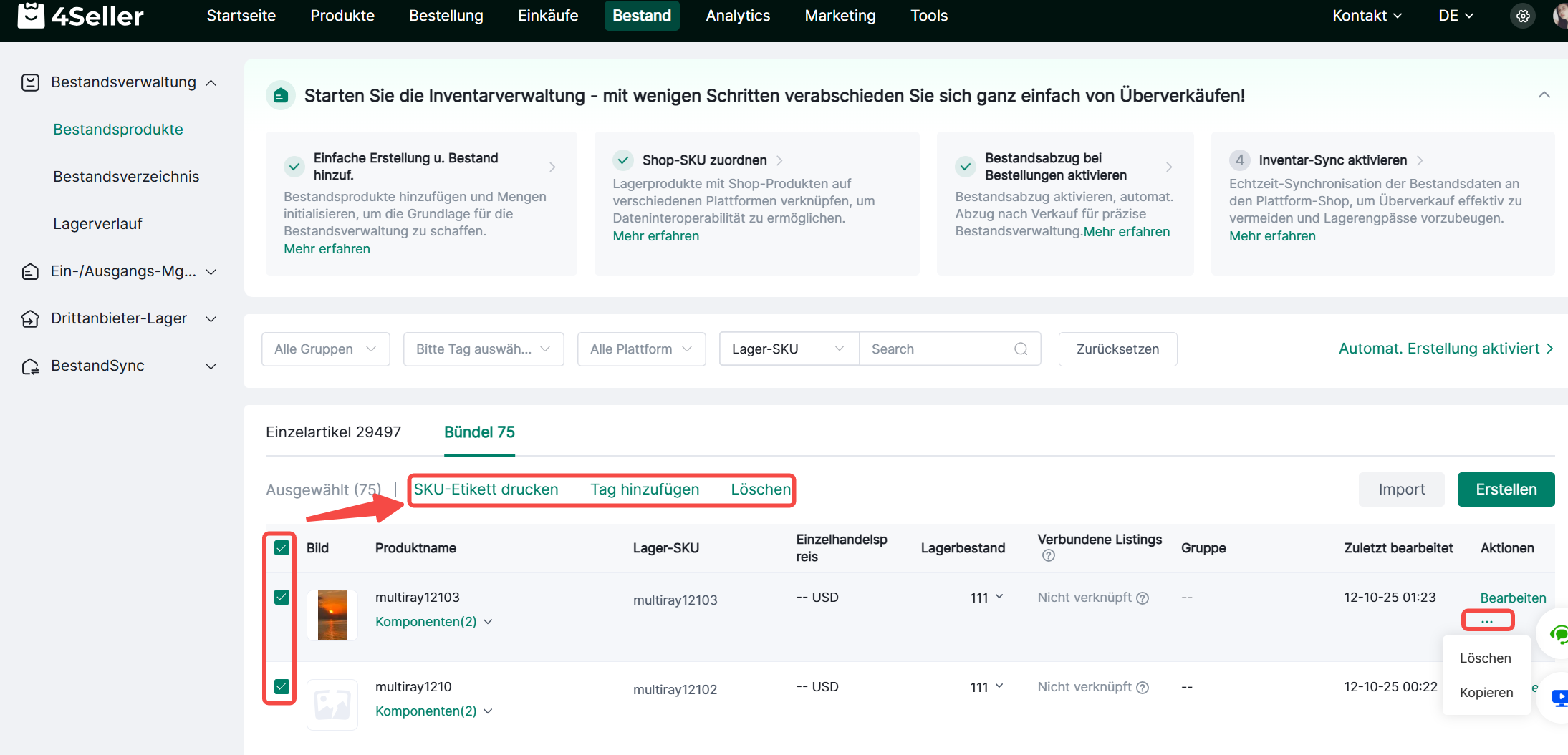 Sie können filtern, um Bundle-Produkte zu prüfen, SKU-Labels zu drucken, Tags hinzuzufügen, massenhaft zu löschen, erneut zu bearbeiten oder zu kopieren usw.