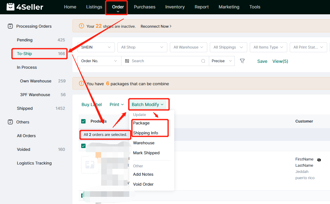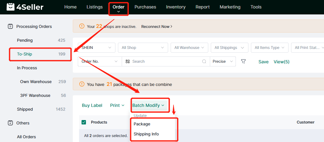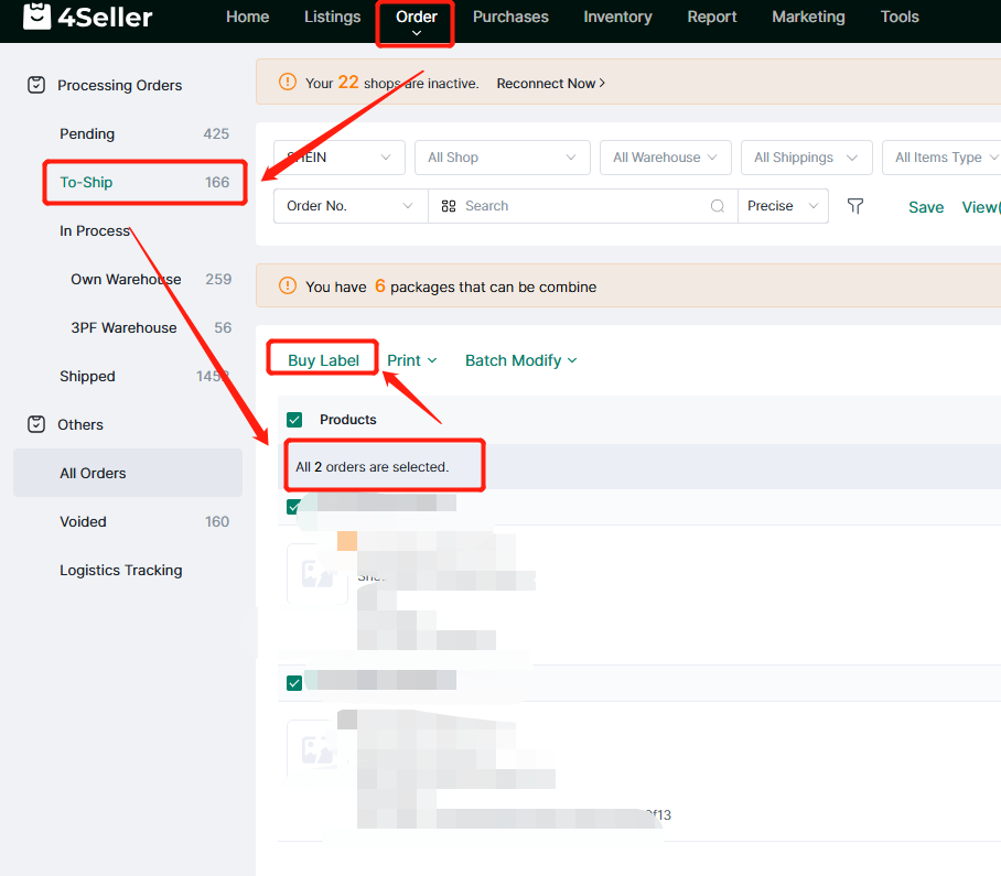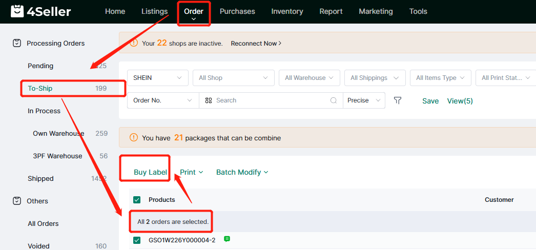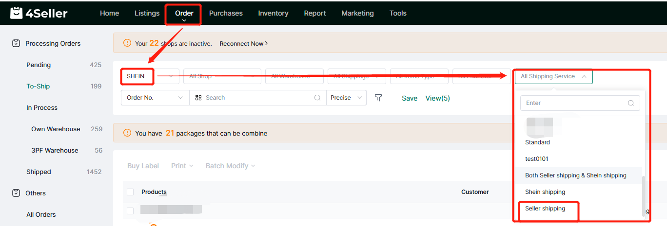 Step 2: On the order page, you can fliter Shein platform and Seller shipping orders type.