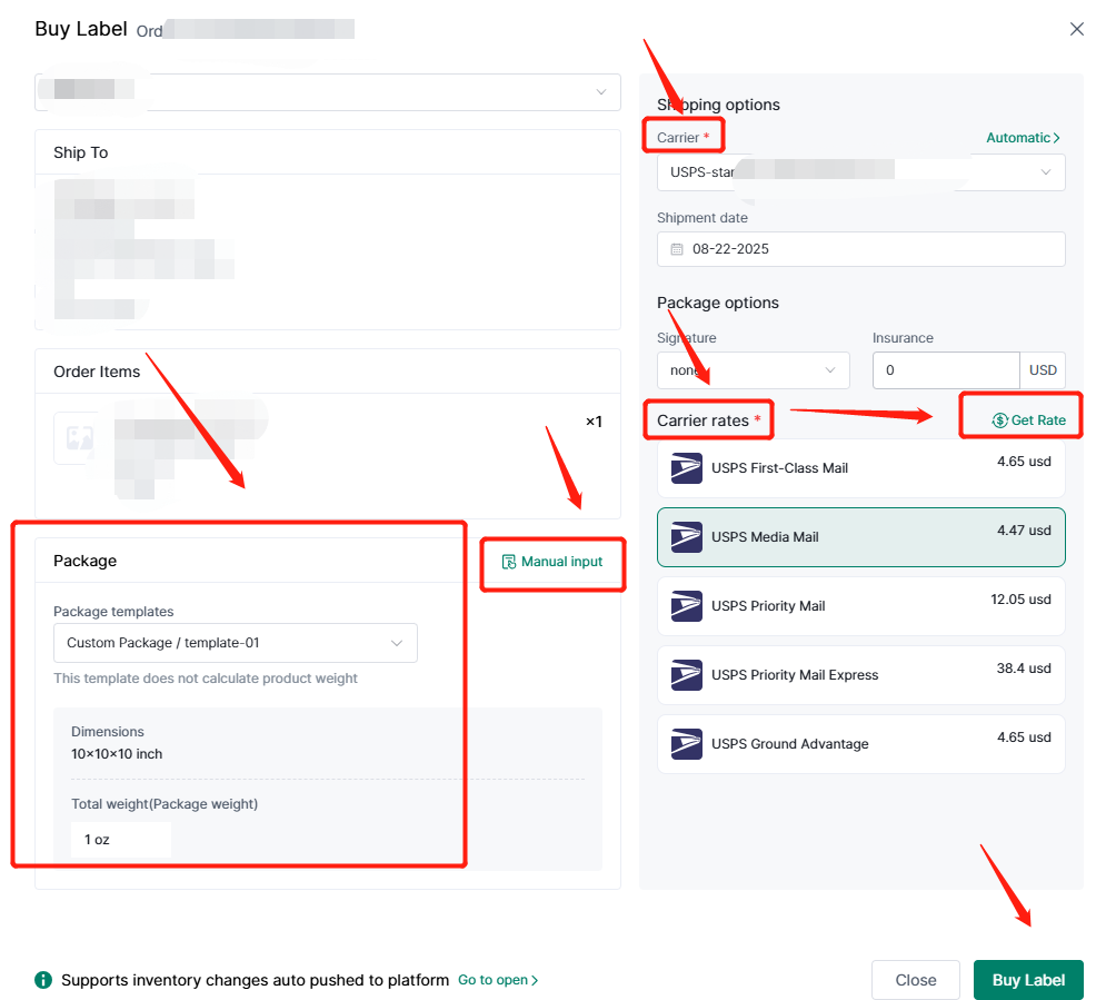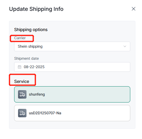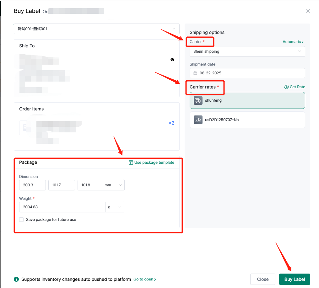 On the Buy Label page, please confirm the following information:1. For the shipping carrier, you can select Shein Shipping or shipping carriers.