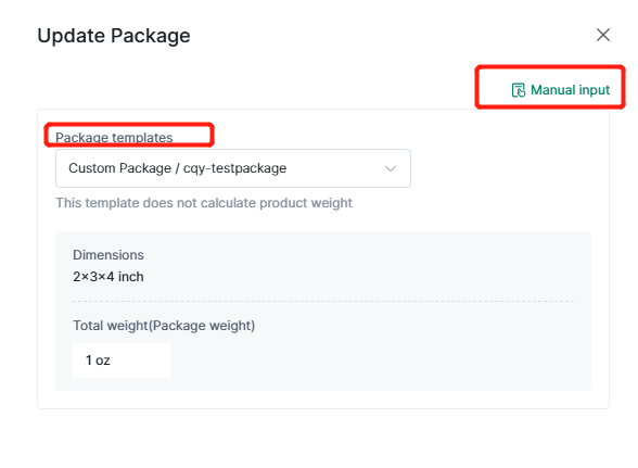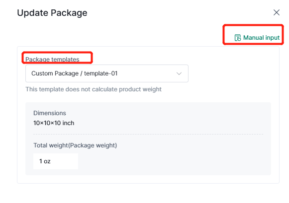 Click package to update package info in batch, you can manual dimension and weight, or select package template, then click save.