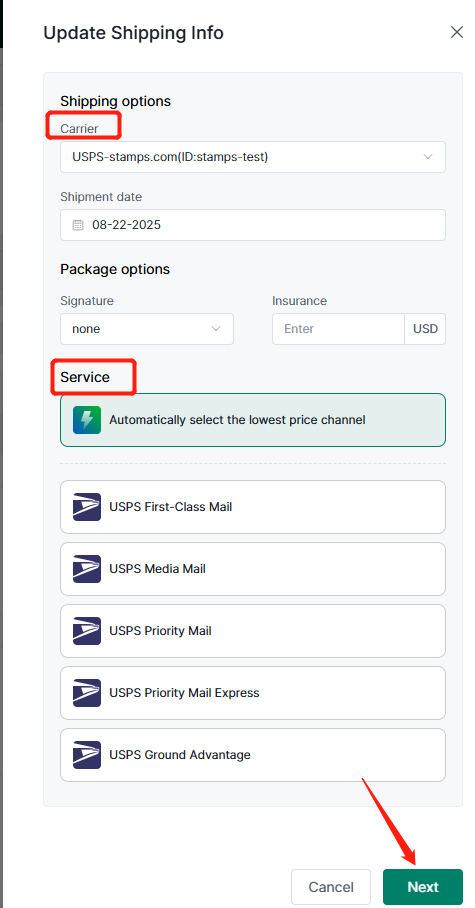 Click shipping Info to update the shipping info with carriers and shipping services, you can select the shipping carriers and services then click save.