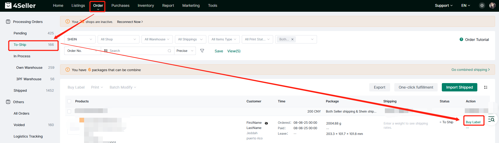 Simply click the corresponding order Buy label option to enter the purchase label page for that order. If the order is shipped by Shein shipping, you can select "SHEIN Shipping". If the order is seller shipping type, follow the instructions in method 2 above. You must first authorize the logistics provider to 4Seller.