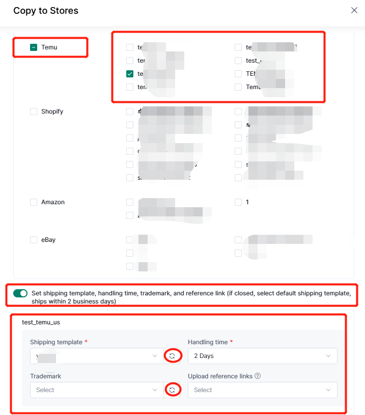 3. In the "Copy to" column, select the target store platform and store name, selct shipping template, handling time, trademark , upload reference links, then choose "copy" or "skip" to decide whether to skip the product (including deleted product in this shop) which has already been copied to the target shop or not.