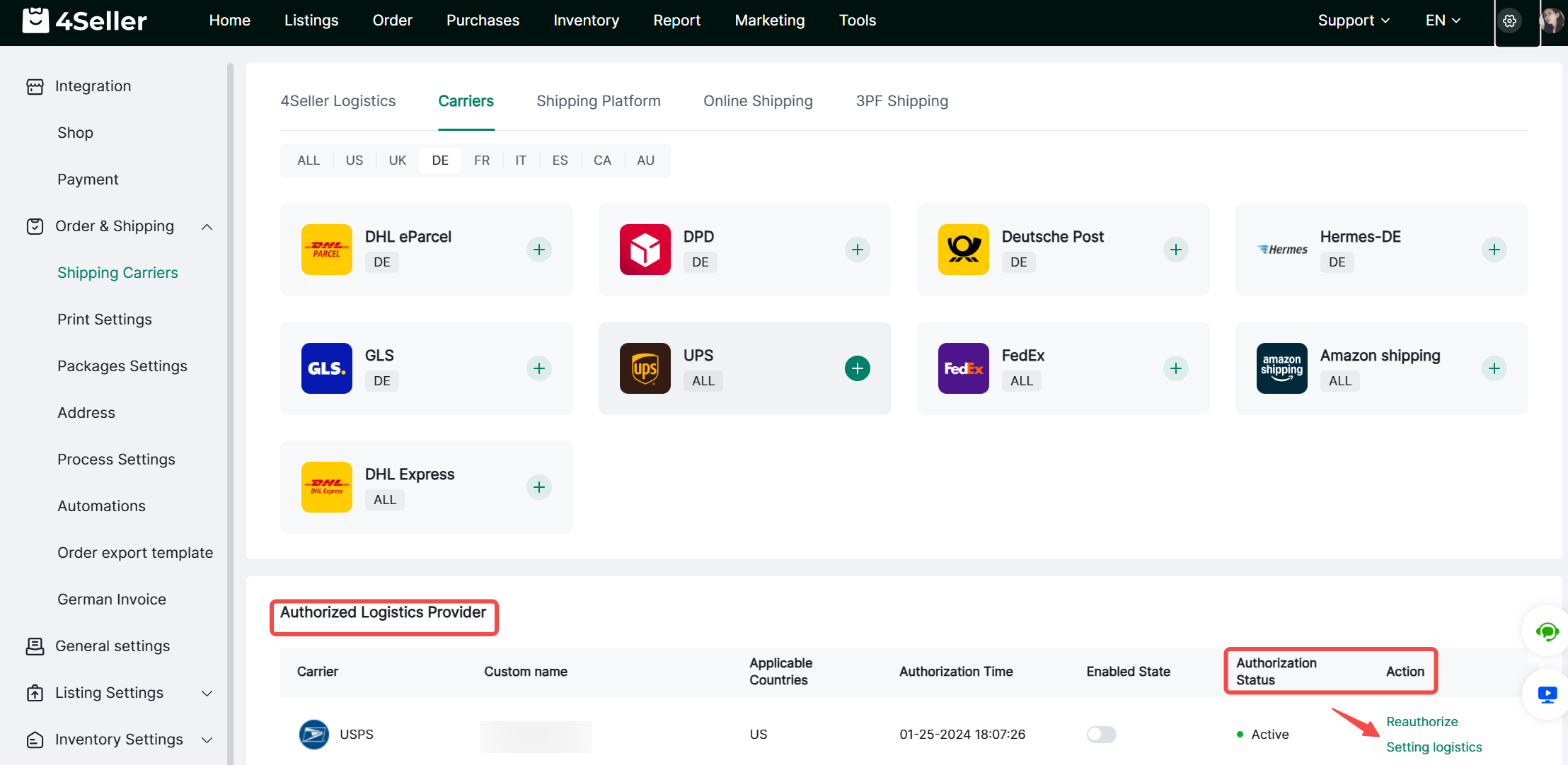 Step 2: Setting-Order&Shipping-Shipping Carrier- Carriers-Add account