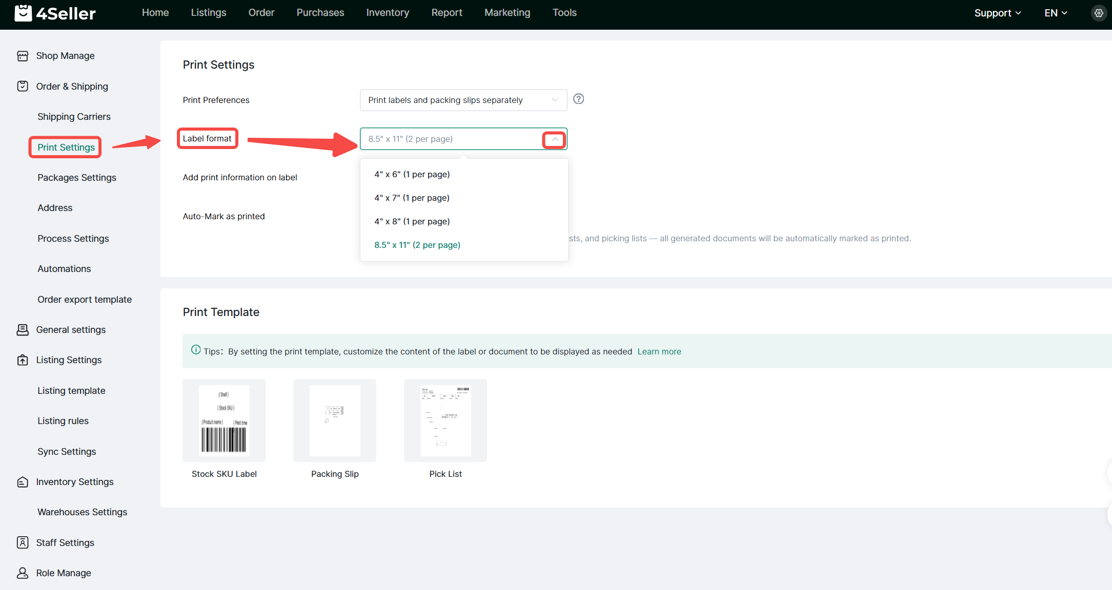 1、Click Settings-Order&Shipping-Print Settings.