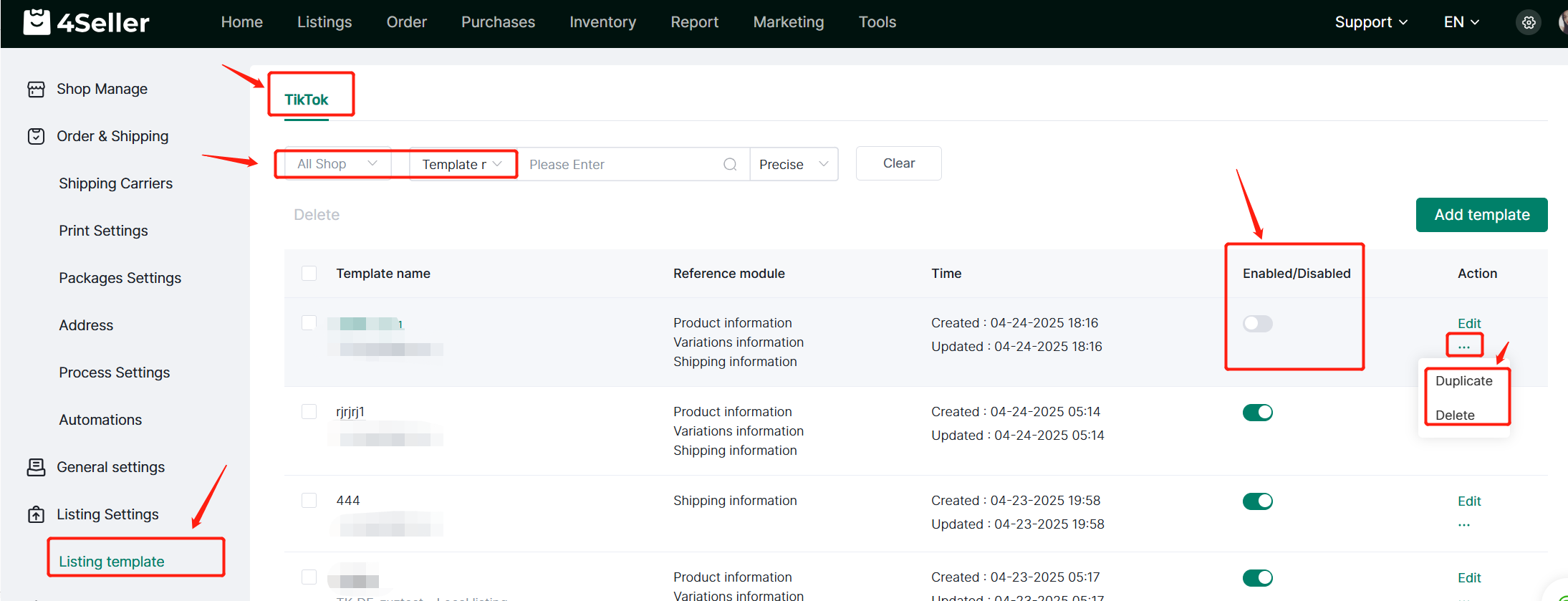 4Seller supports referencing listing templates when listing in TikTok shop which improve listing efficiency.