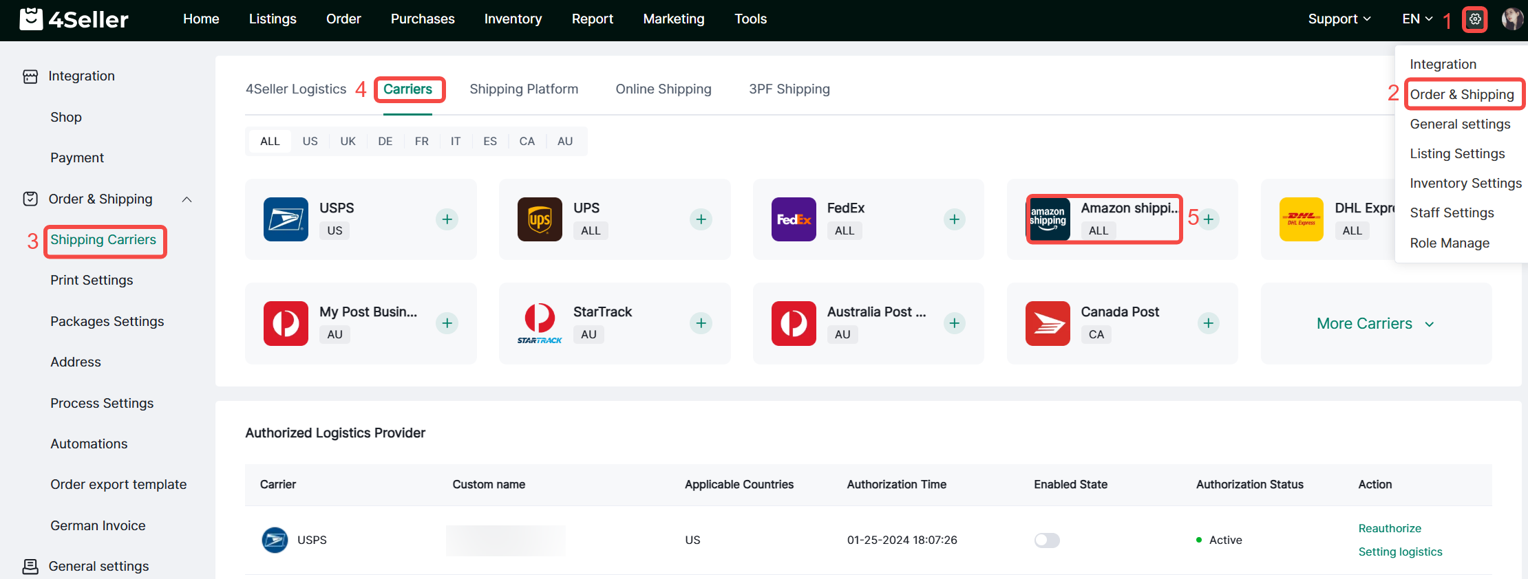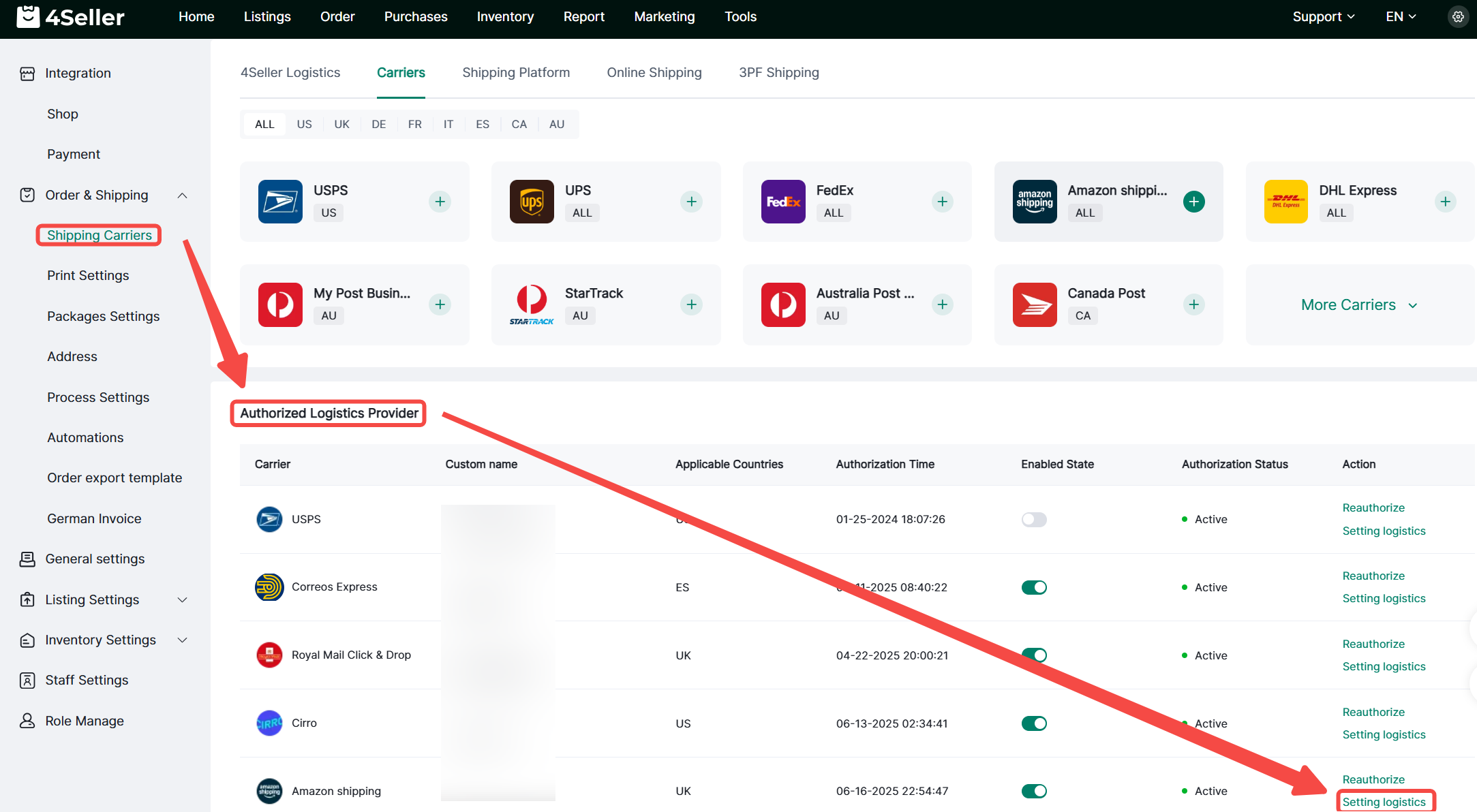 1、 Setting-Order & Shipping-Shipping Carriers-Carriers-Click the “+” sign.