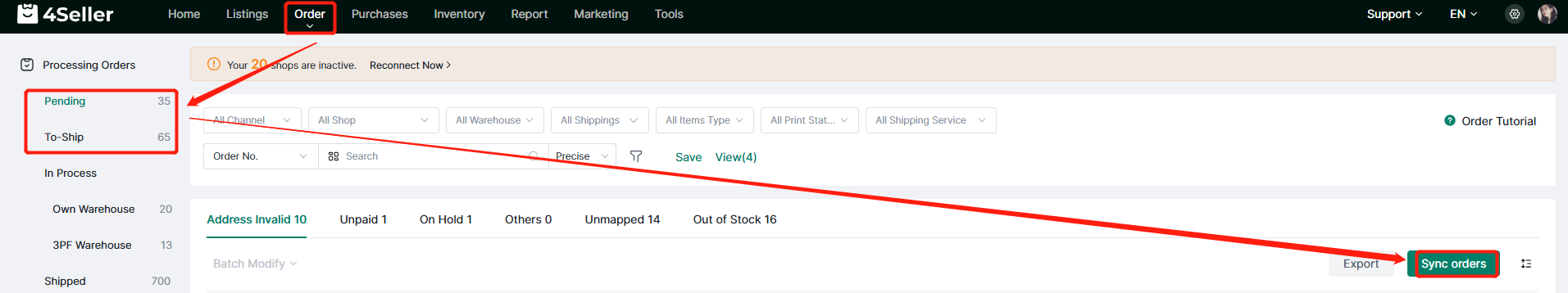 If the order didn't sync to 4Seller with real time, you can click sync orders to sync to 4Seller. Note: Only orders under " Peding" or" To- Ship" can be click to synced. Any problem pls contact 4Seller Support Team: support@4seller.com