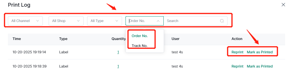 The print log supports filtering according to the following conditions, and supports reprinting and marking as printed.