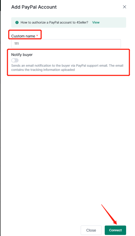 Step 2: Custome name--Select If open "Notify buyer"(If open will send an email notification to buyer with details tracking information)--Click"Connect"