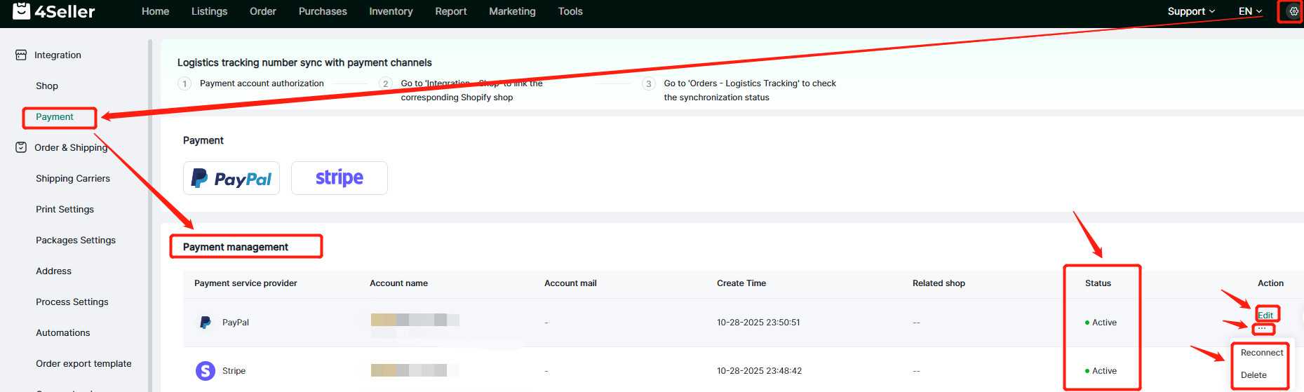 Step 5: Setting--Payment--Payment management--Check status & edit & delete & reconnect