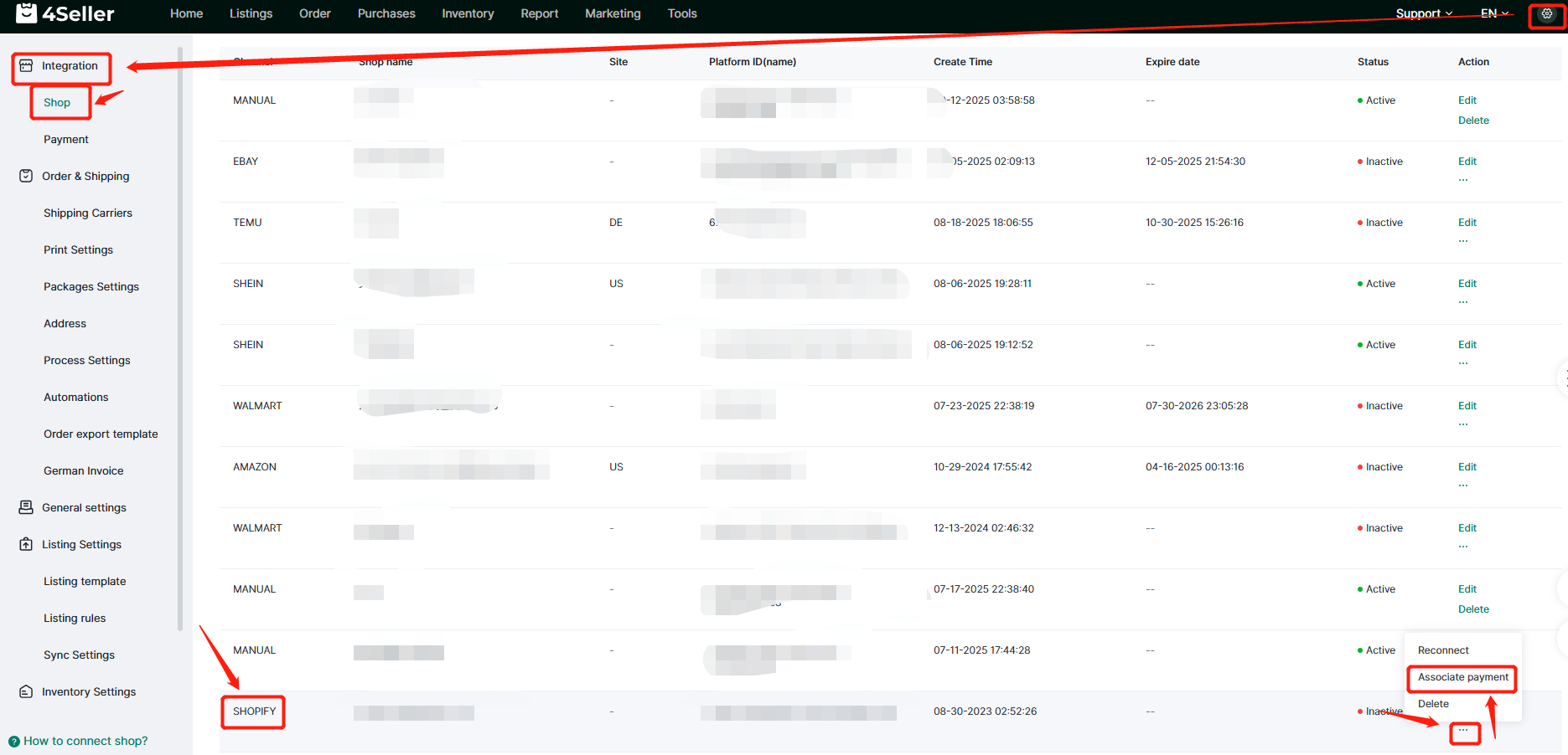 Step 6: Setting--Integration--Shop--My shop--select shopify stores to associate payment