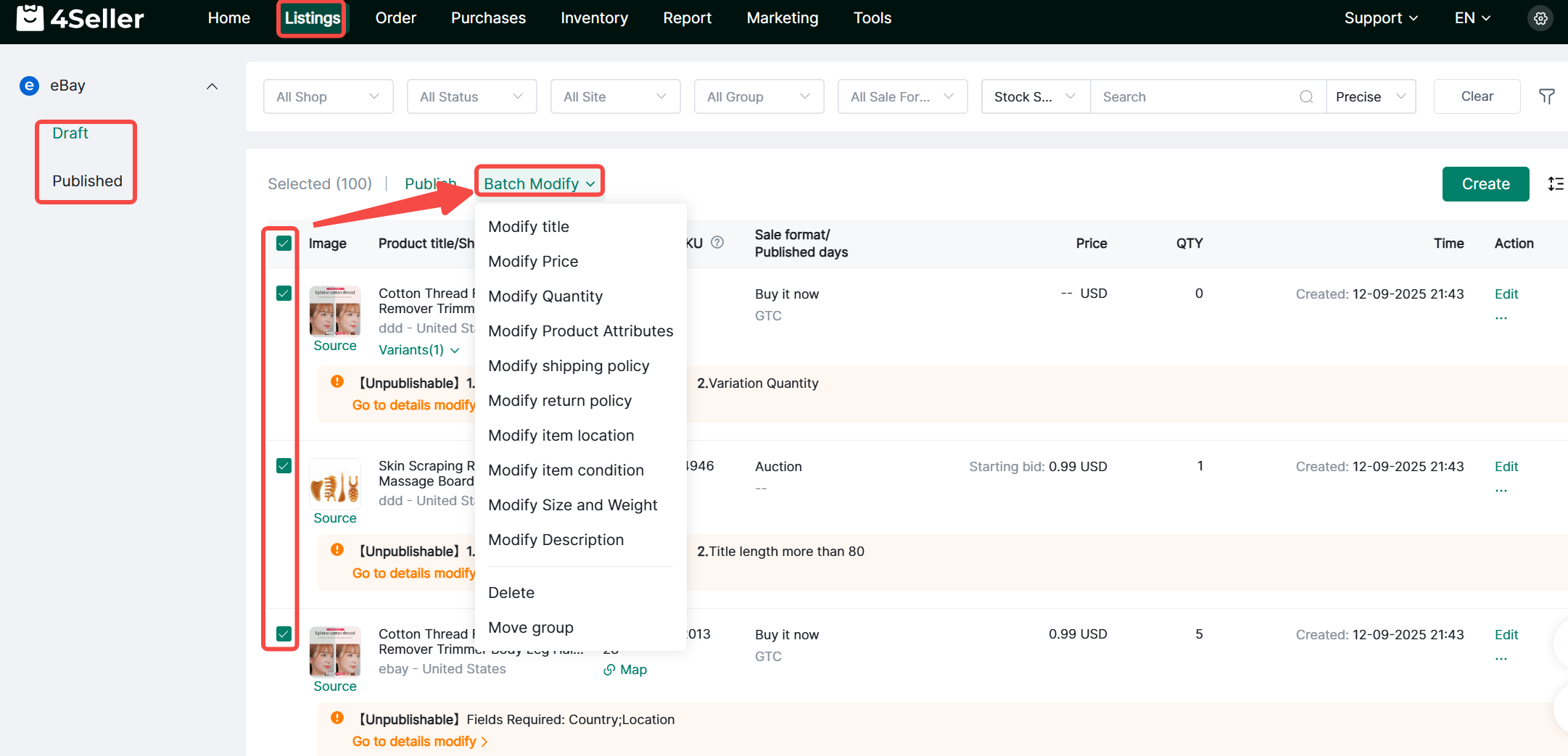 4Seller supports batch modification of individual attributes across multiple products to enhance listing efficiency for eBay.