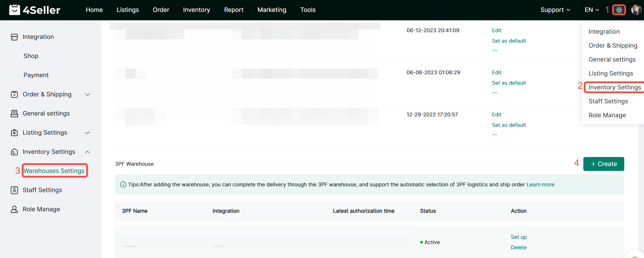 Click the Settings button to enter the Inventory Settings page, then click Create in 3PF Warehouse to enter the Add Your FBA page to add the FBA warehouse.