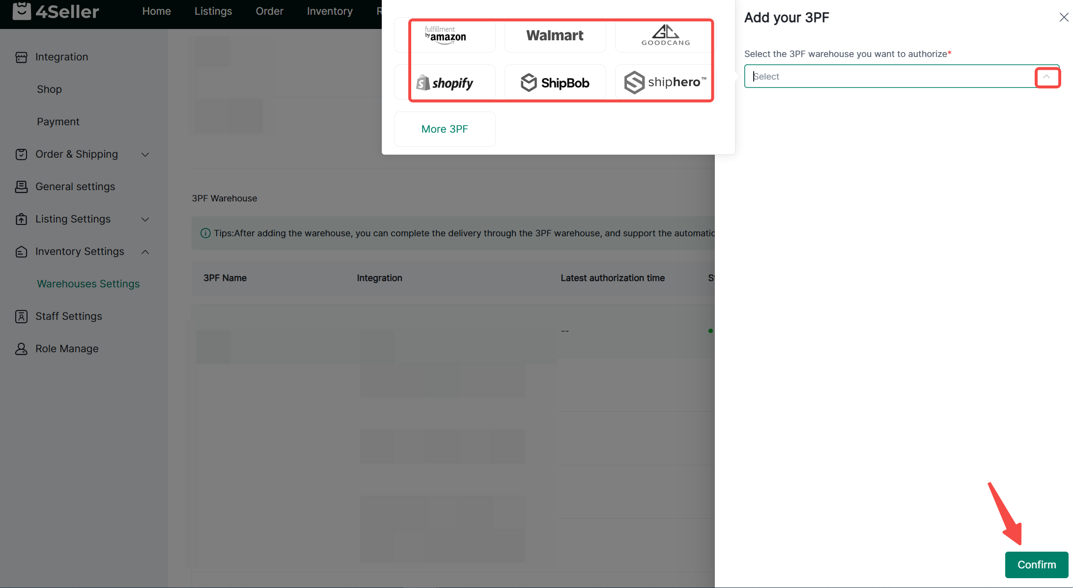 Before authorizing the Amazon warehouse, you need to have authorized the Amazon store in 4seller's Shop Manage.