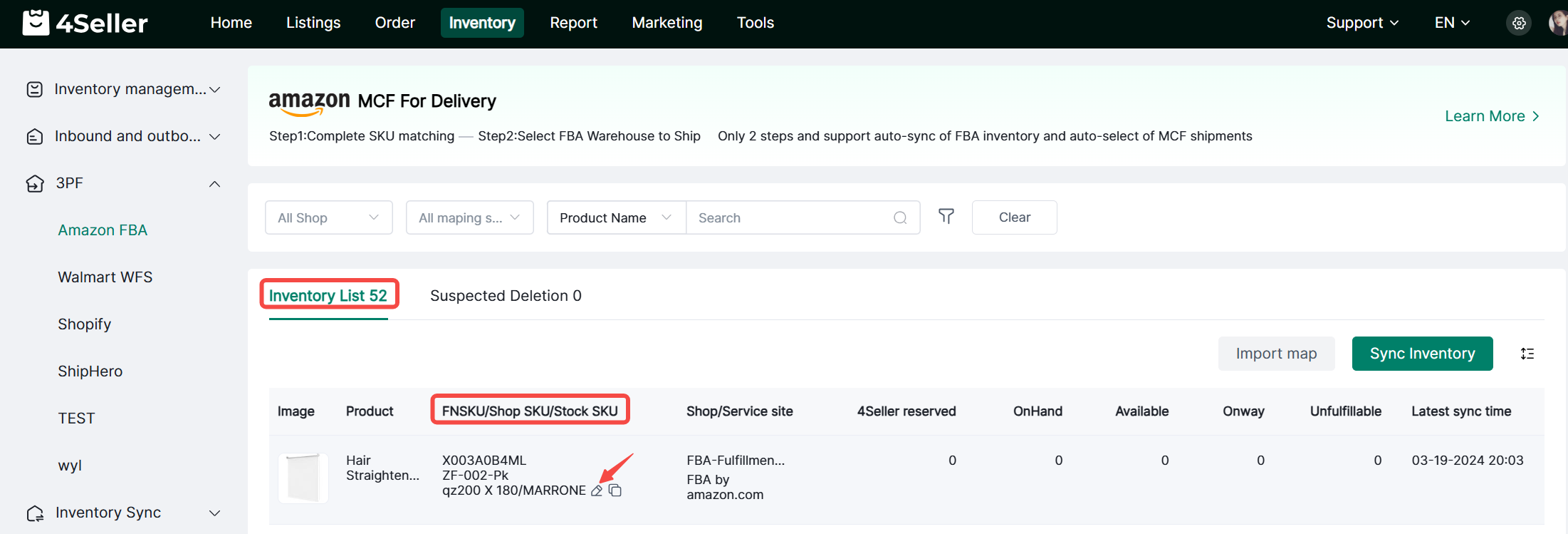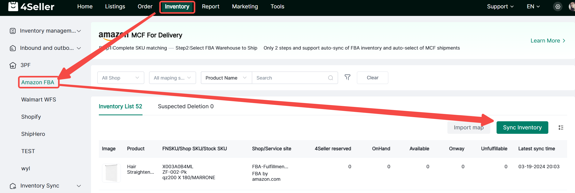 Enter Inventory, click FBA in 3PF, and then click Sync Inventory to synchronize the inventory of the authorized FBA warehouse.