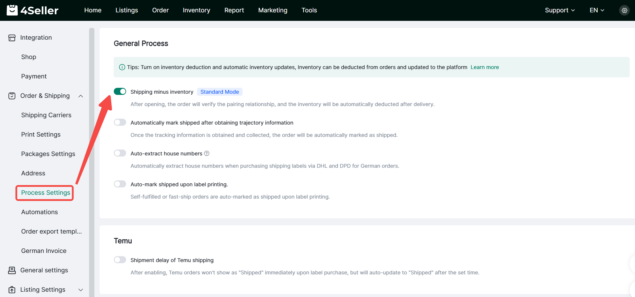 Step 3.1 Turn on Shipping minus inventory optionTo use Amazon MCF to fulfill orders, you need to first enable the Shipping minus inventory option, click the Settings button to enter the Order & Shipping settings page, then click Process Settings, enable the Shipping minus inventory option to use inventory for shipping.