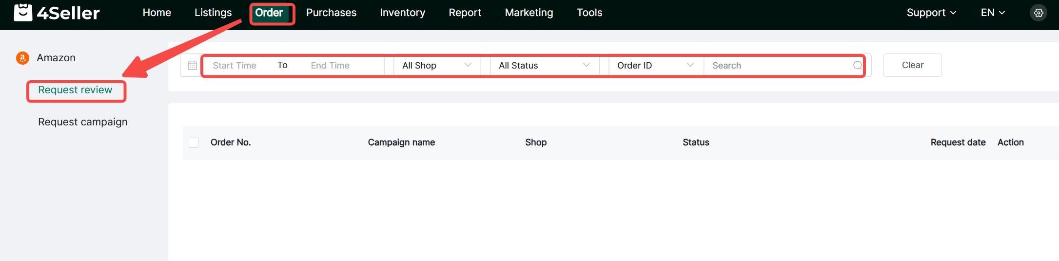 4Seller supports setting review request rules. For qualifying Amazon orders, it automatically sends review invitations to buyers after shipment and maintains review request records.