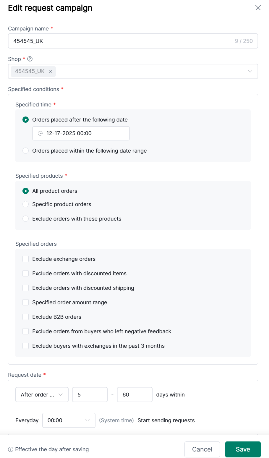 (2) Enter rule name, select applicable store (each store can only be included in one rule), choose specified conditions and request time. Rules take effect the following day after saving.
