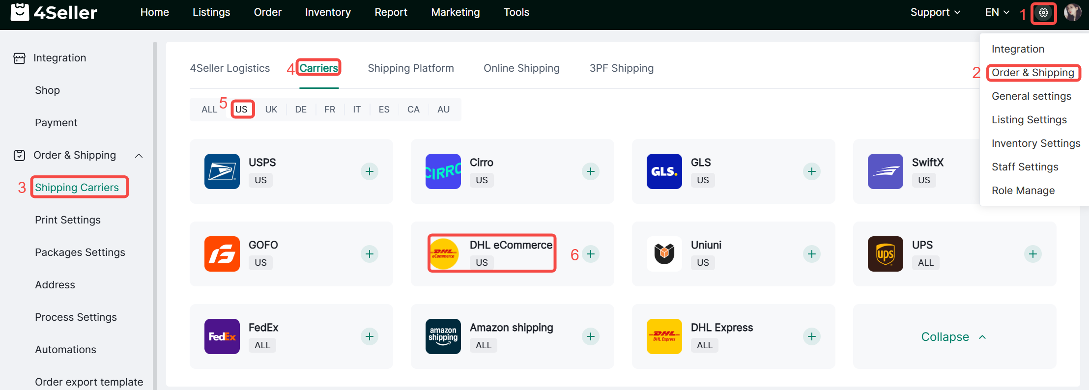 Step1:Click Settings-Order&Shipping-Shipping Carriers-Carriers, find DHL eCommerce icon and click add .