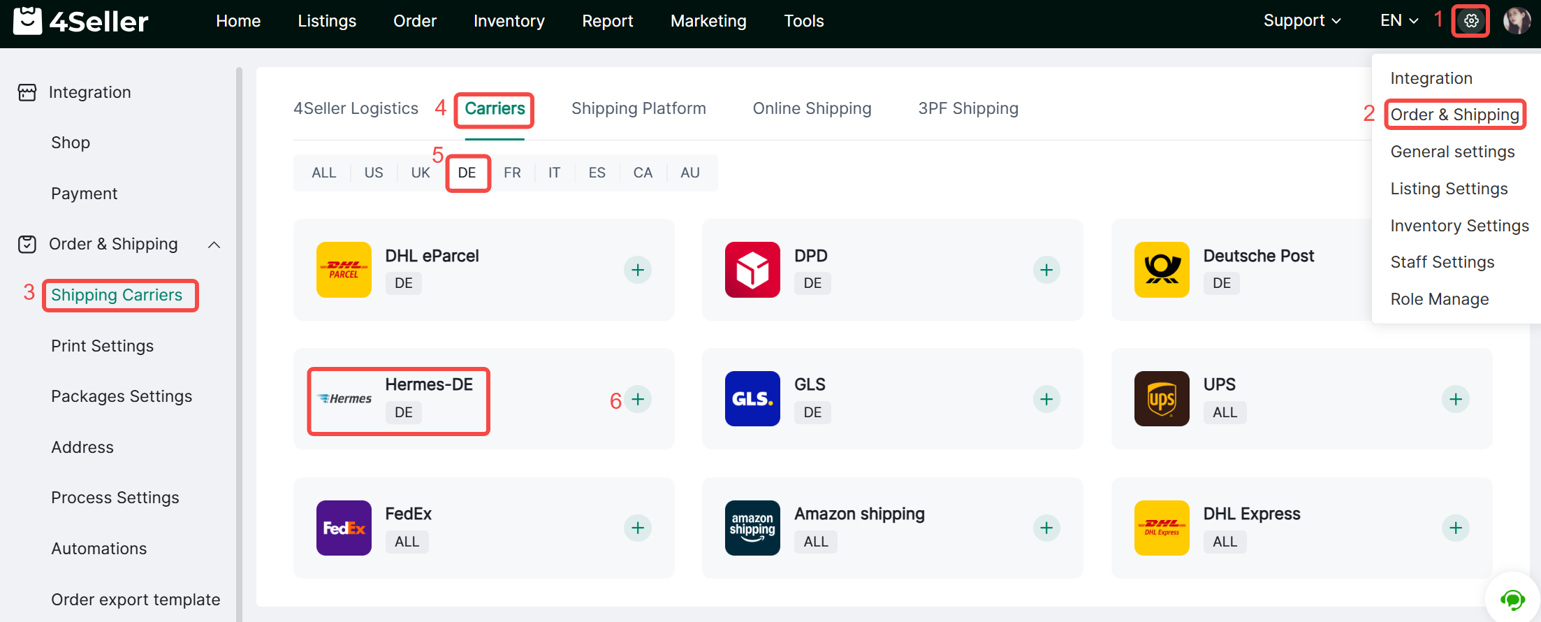 Step1:Click Settings-Order&Shipping-Shipping Carriers-Carriers, find Hermes DE icon and click add .